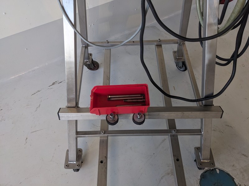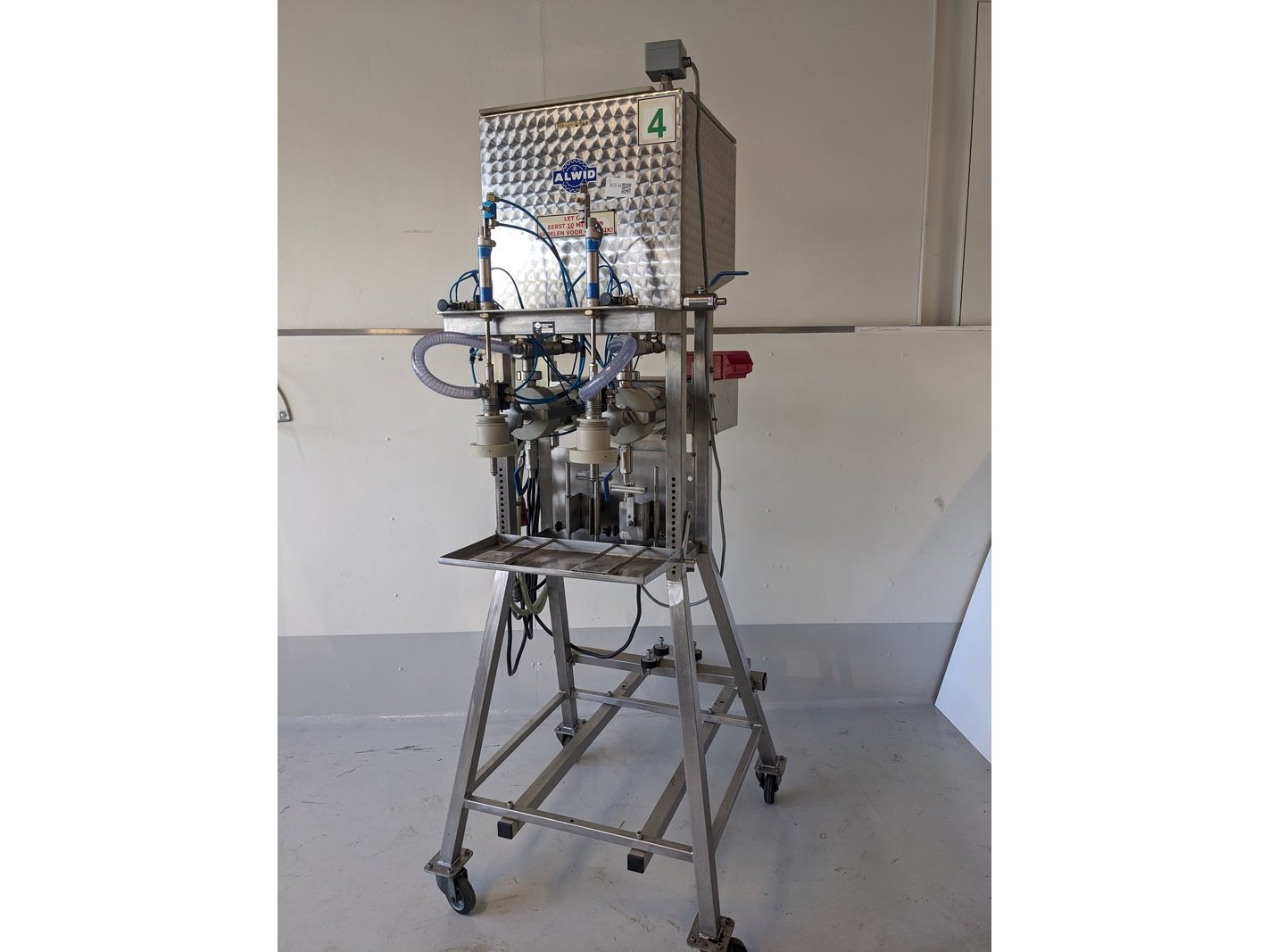 Merk: Alwid Product: Flessen vulmachine Materiaal: RVS Afmeting: L120cm x B80cm x H210cm BouwJaar: 1989 Conditie: gebruikt Specificaties: 2 kops vulmachine, pneumatisch, volume instelbaar, 380V, met buffertank ca 85 liter, reduceerventiel, RVS onderstel op bokwielen, DN40 aansluitmaat