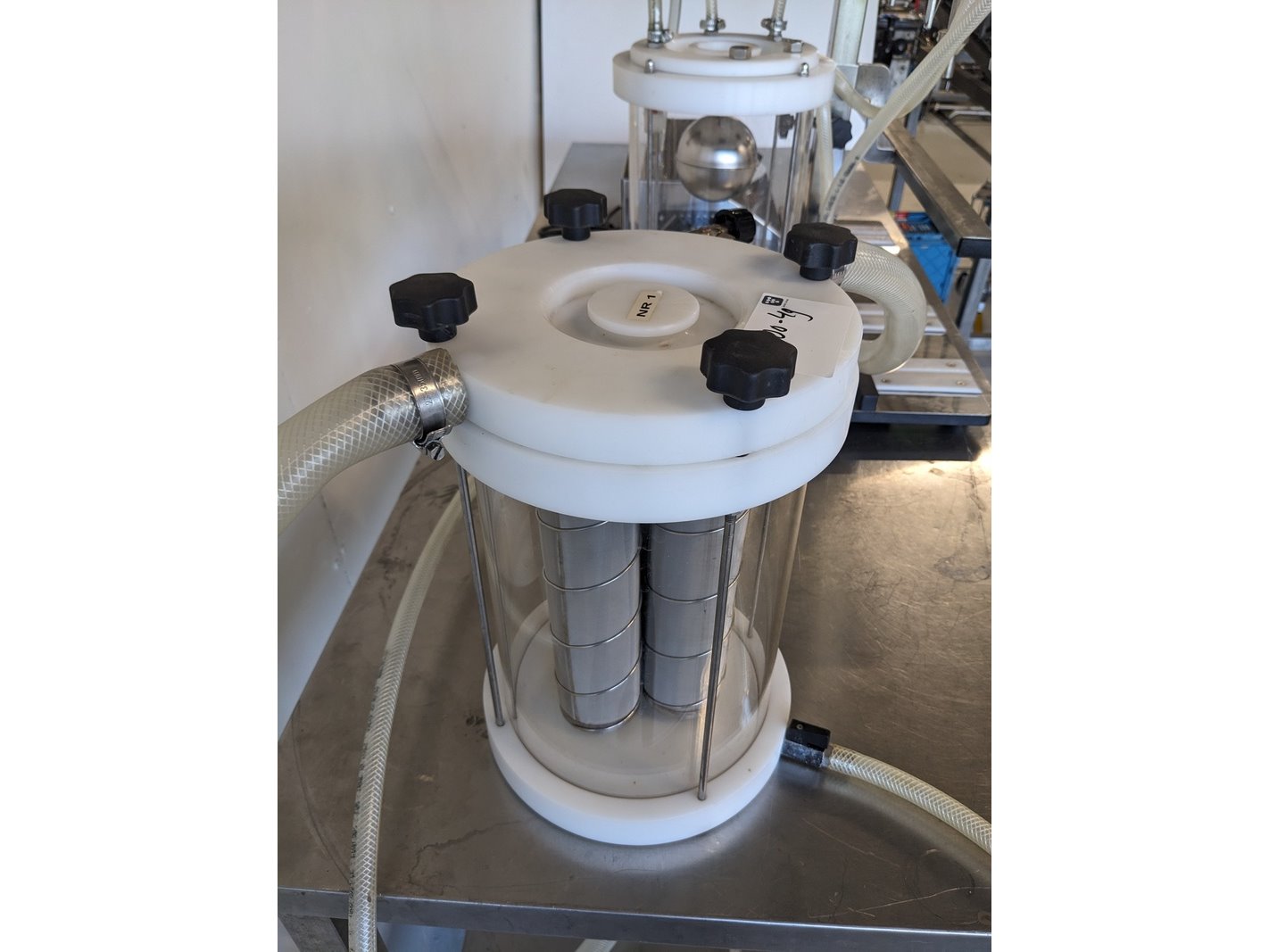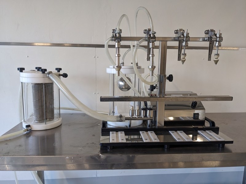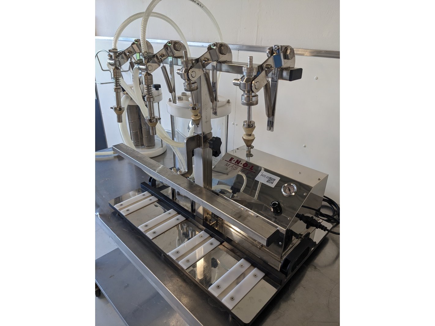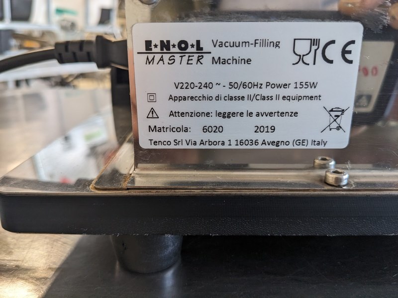 Merk: Enol Product: Flessenvuller Kleur: wit Materiaal: RVS Afmeting: L65cm x B47cm x H70cm BouwJaar: 2019 Conditie: gebruikt Specificaties: vacuüm manuele flessenvuller, 2 vul koppen voor grote flessen, 2 vul koppen voor miniatuurflessen, voorraadtank met vlotter, filterhuis, divers slangen, 220V