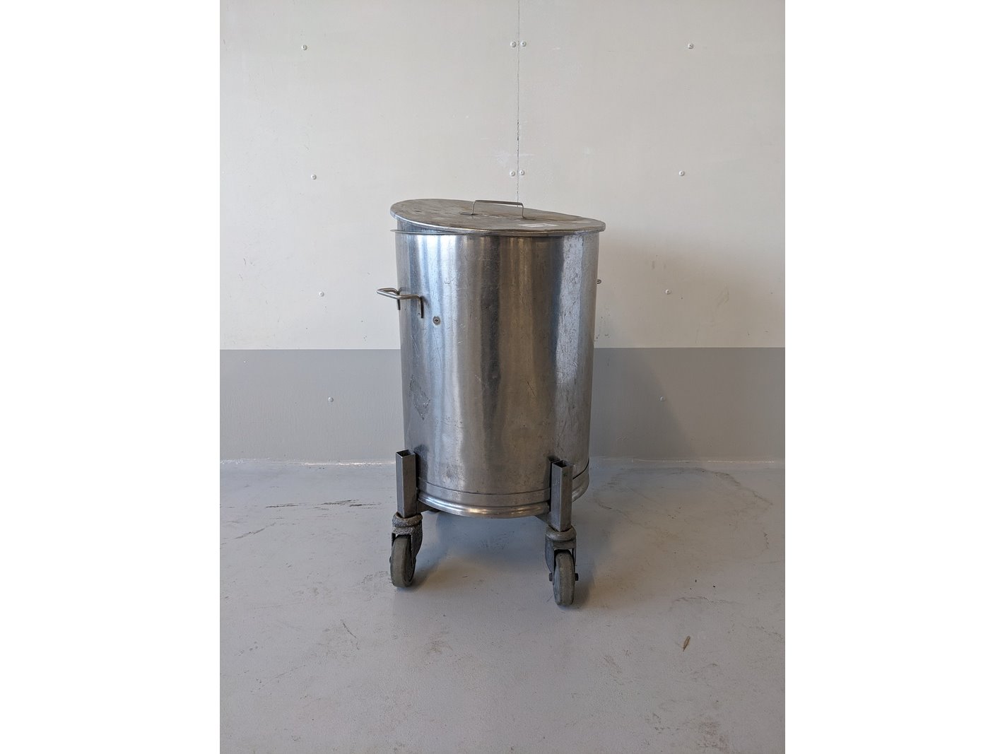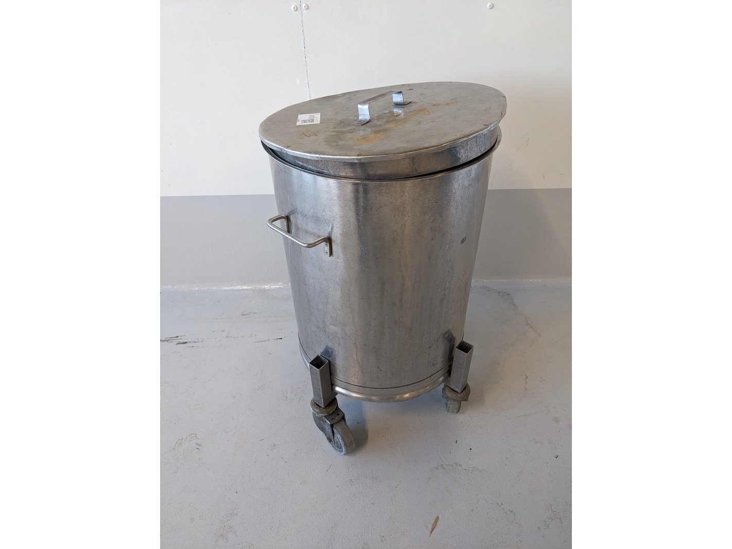 Product: Opslag tank Materiaal: RVS Afmeting: D45cm x H70cm Conditie: gebruikt Specificaties: verrijdbare opslag tank met deksel, circa 50-60 liter