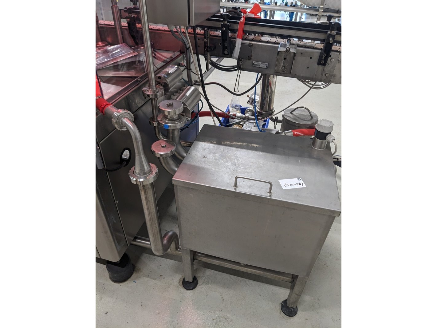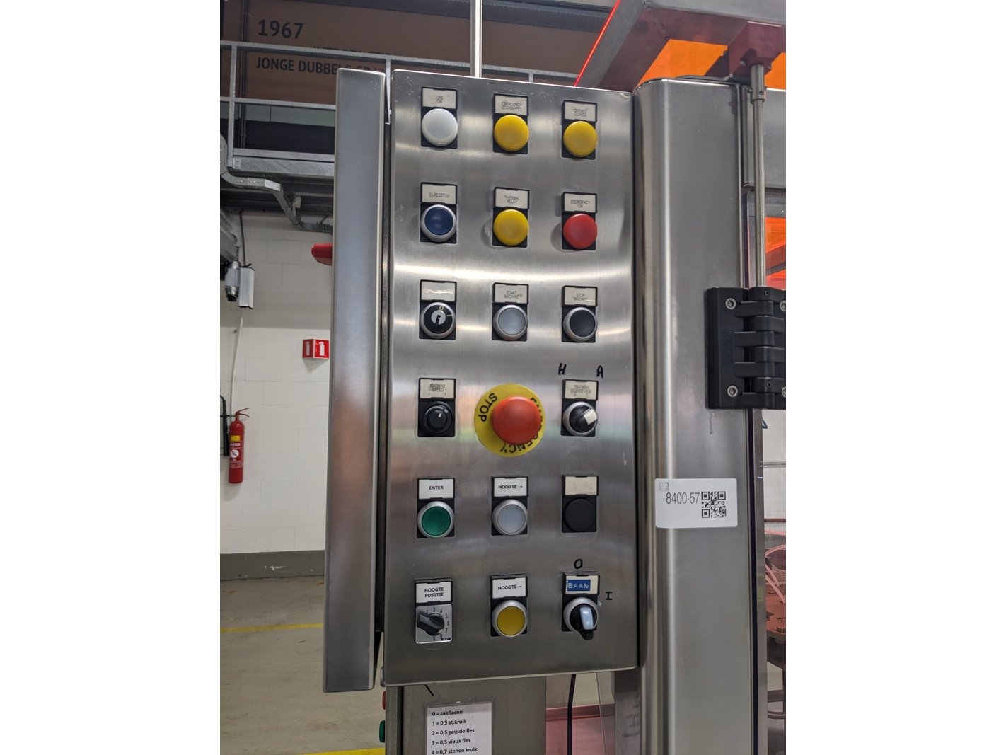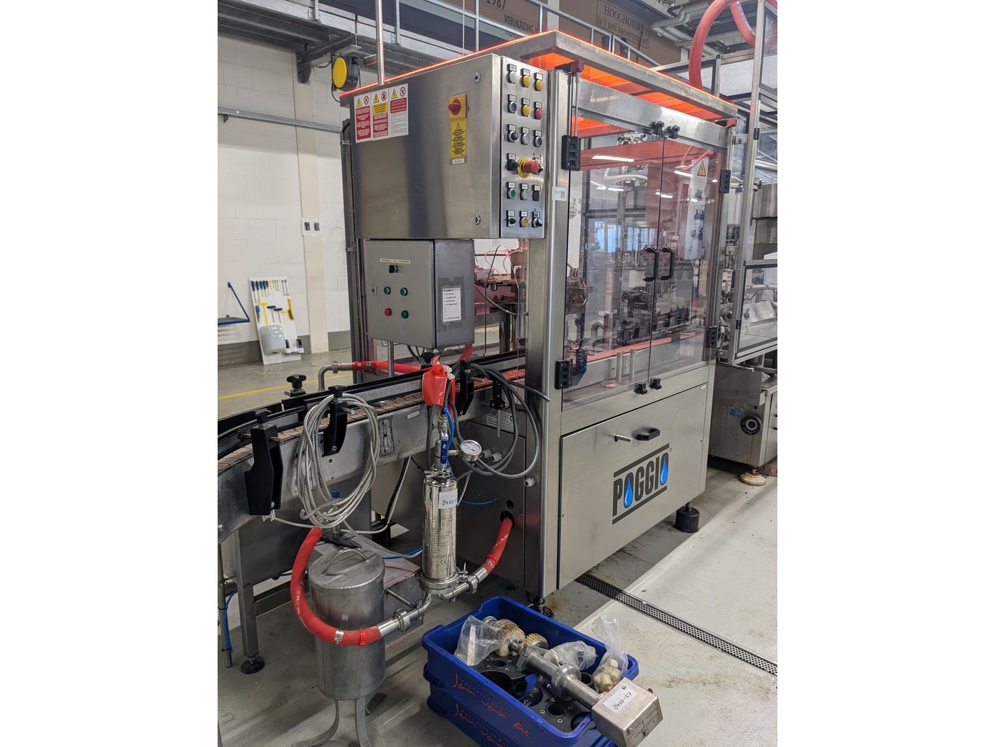 Merk: Poggio Product: Rinser / flessen spoeler Materiaal: RVS Afmeting: L200cm x B125cm x H213cm BouwJaar: 2006 Conditie: gebruikt Specificaties: -Flessen spoeler, capaciteit max 1500 eenheden/uur in combinatie met 6 spoelkoppen, (5 extra koppen zijn aanwezig) links-rechts, fleshoogte ca 190 to 380 mm. bedieningskast, rinsbak 56x40x73cm met pomp en filter, niveau controle, pneumatische afsluiters -Inclusief formaatdelen, inclusief reserve onderdelen bestaande uit: in en uitvoersterren, tussenstukken, verwisselbare grijperbekken