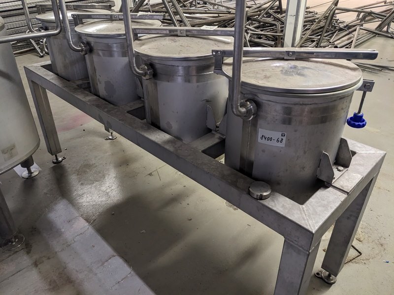 Merk: De Jager Product: Extractie tanks op frame Materiaal: RVS 304 Afmeting: L210cm x B57cm x H115cm Conditie: gebruikt Specificaties: frame met 4 extractietanks van circa 65 liter/stuk, uitgevoerd met deksel en RVS filtermand, allen voorzien van aftapkraan en vulleiding