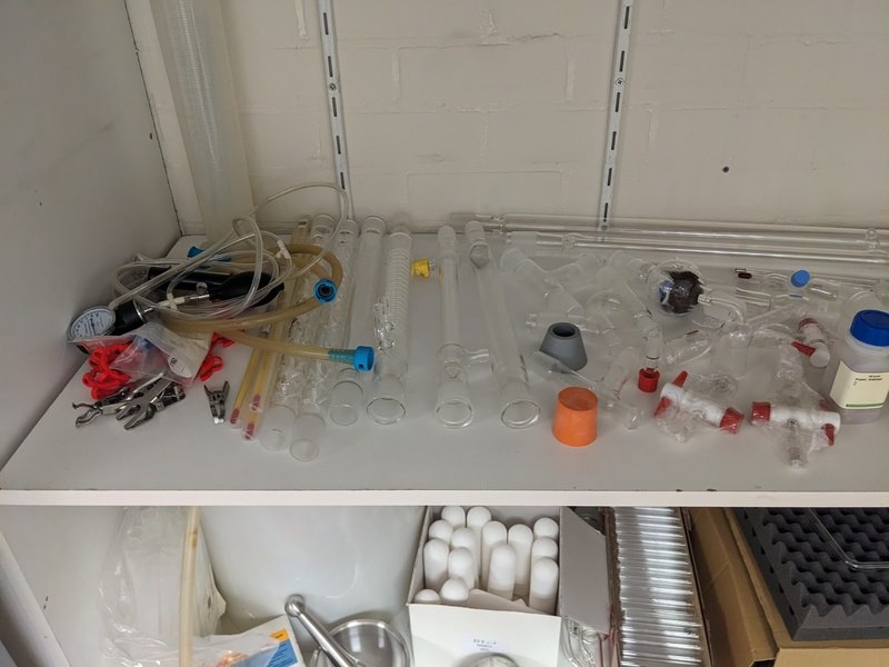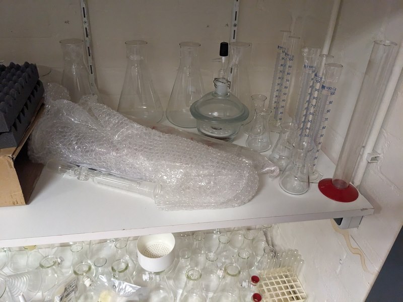 Product: Inhoud laboratorium schuifkast Conditie: gebruikt Specificaties: diverse laboratorium hulpmiddelen, destillatie opstelling, glaswerk, condensors, bolflessen, glas pipetten, kraantjes, soxhlet, maatcilinders, Erlemeyers, reageerbuizen, maatbekers, filtratieopstelling, maatkolven