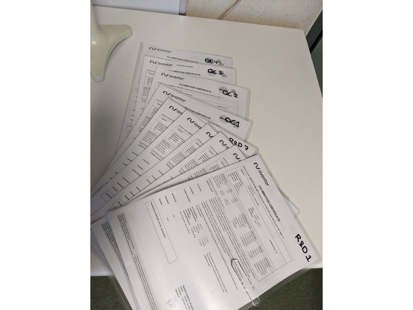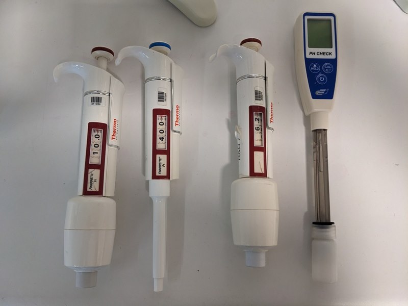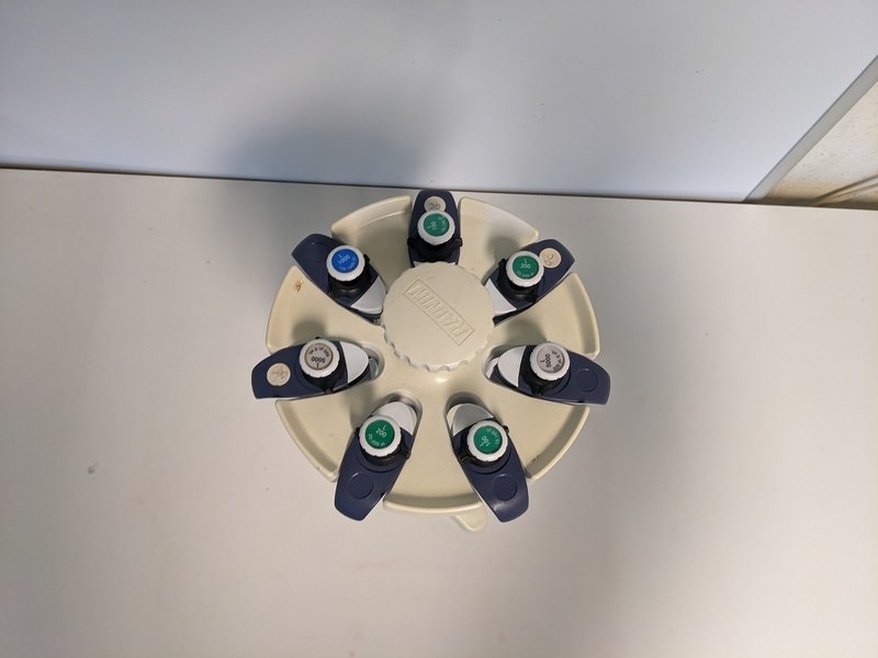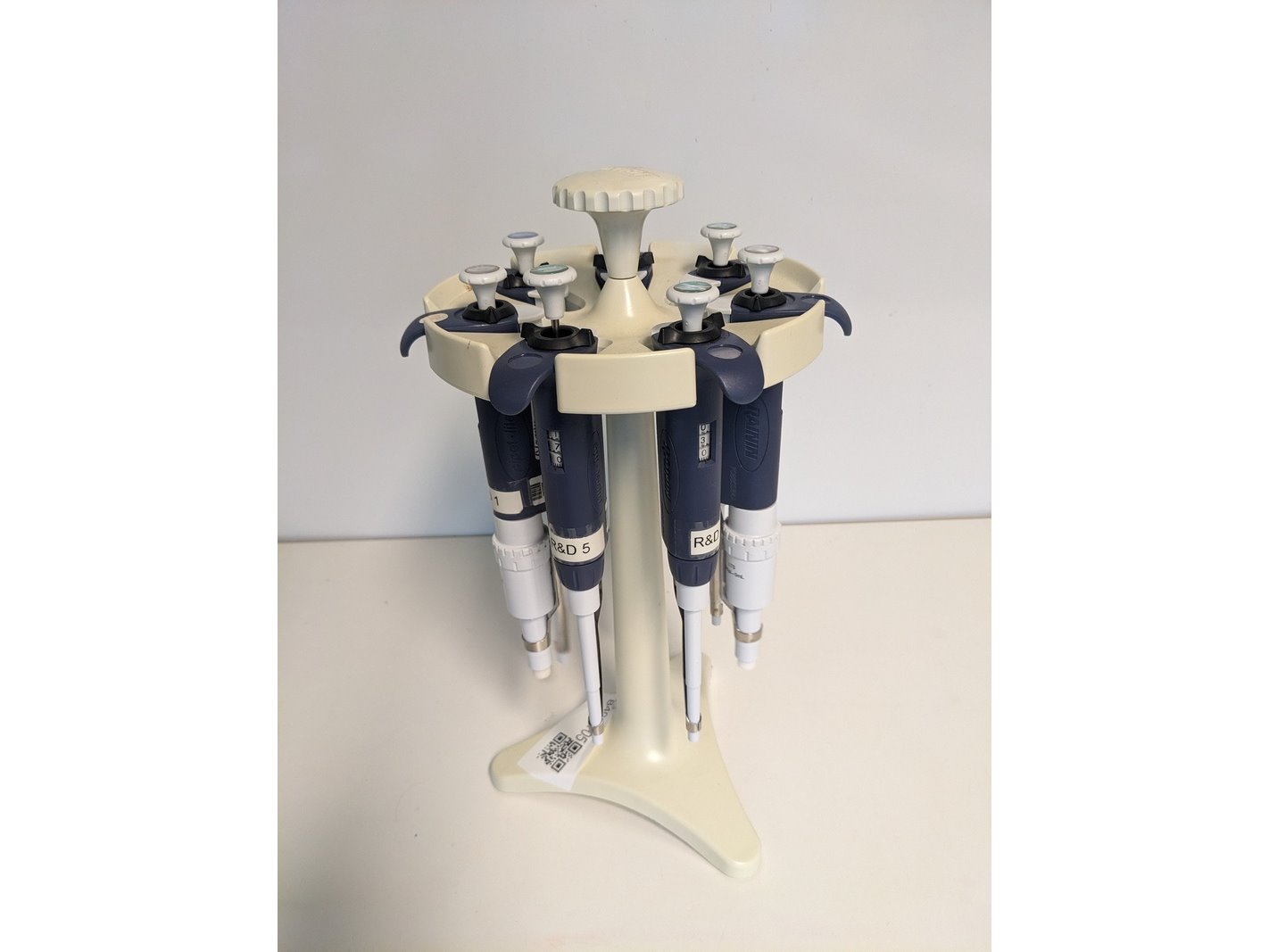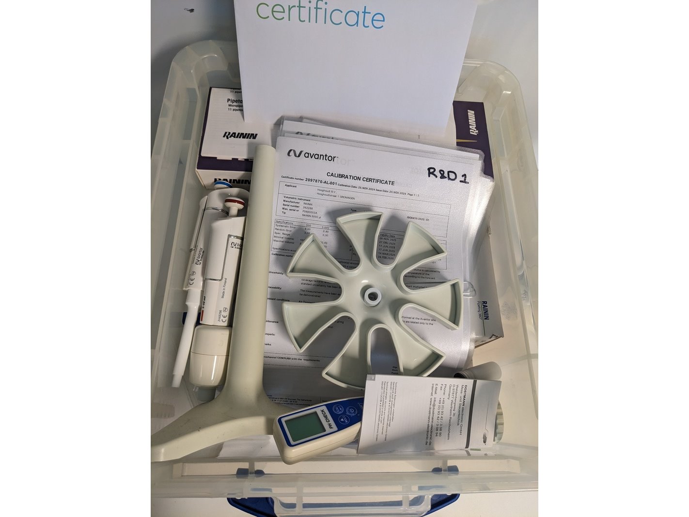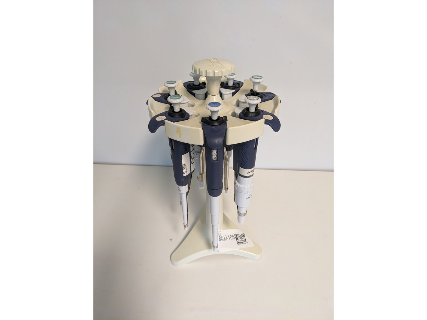 Product: Pippettenset Conditie: gebruikt Specificaties: Laboratorium 7-voudige carrousel pippetenset van 100 tot 10.000 microliter, 3 extra pippetten, PH-meter en divers pippetpunten, in kunststof bak.