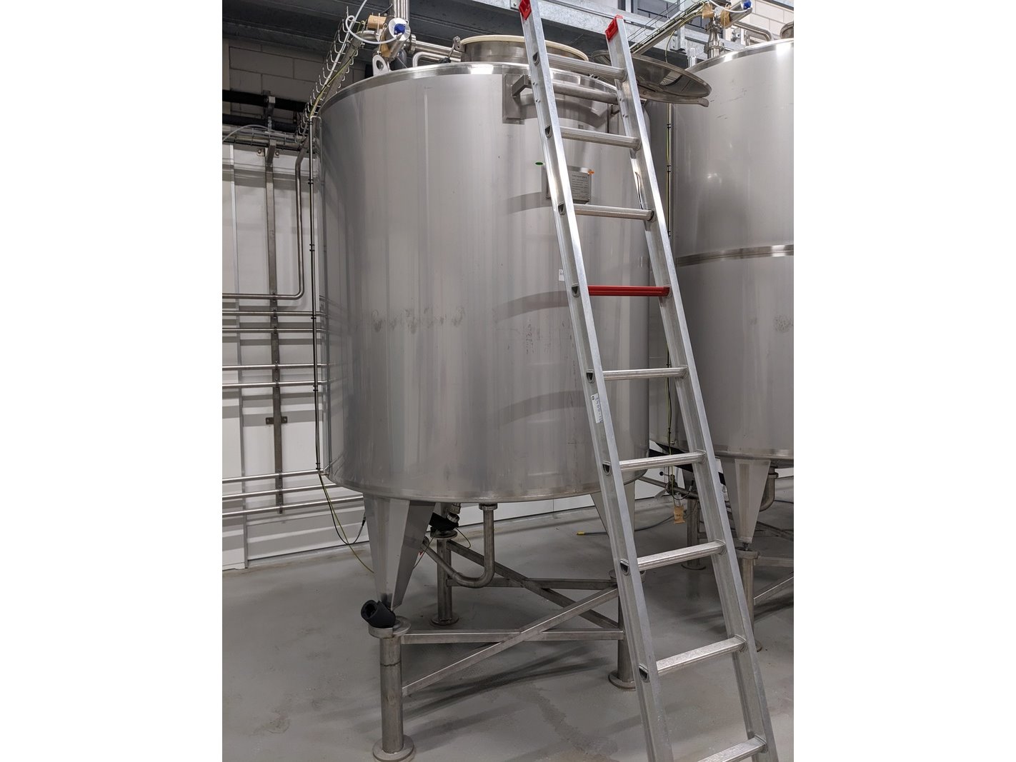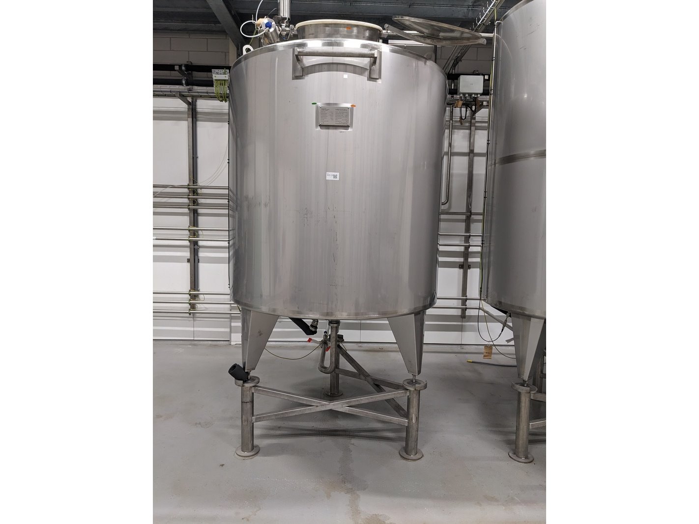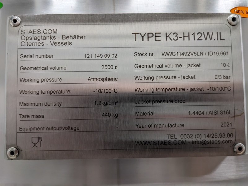 Merk: Staes Product: Koeltank 2500L Materiaal: RVS 316 Afmeting: H238cm x D158cm BouwJaar: 2021 Conditie: gebruikt Specificaties: koeltank op 3 steunpoten en onderstel van 50cm, uitgevoerd met mangat, instrumenten: onder en overdrukbeveiliging, sproeibol, 2 pneumatische afsluiters, aftapleiding, met circa koelleiding met afsluiters, elektronische inhoudsmeting met E+H, PT100 sensor, met alu ladder