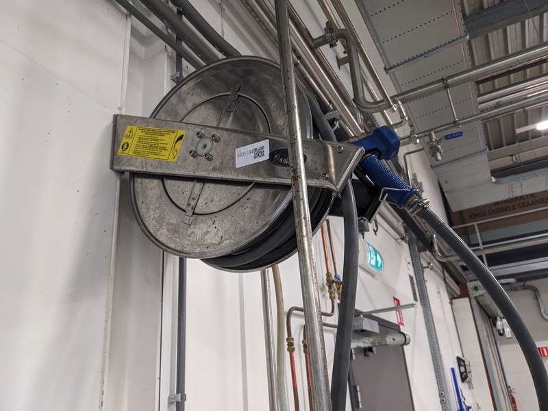 Merk: Ramex Product: Waterslang haspel 15m Materiaal: RVS Afmeting: B20cm x D45cm Conditie: gebruikt Specificaties: slanghaspel met 1/2"slang en sproeier