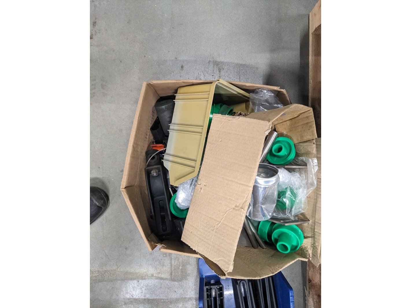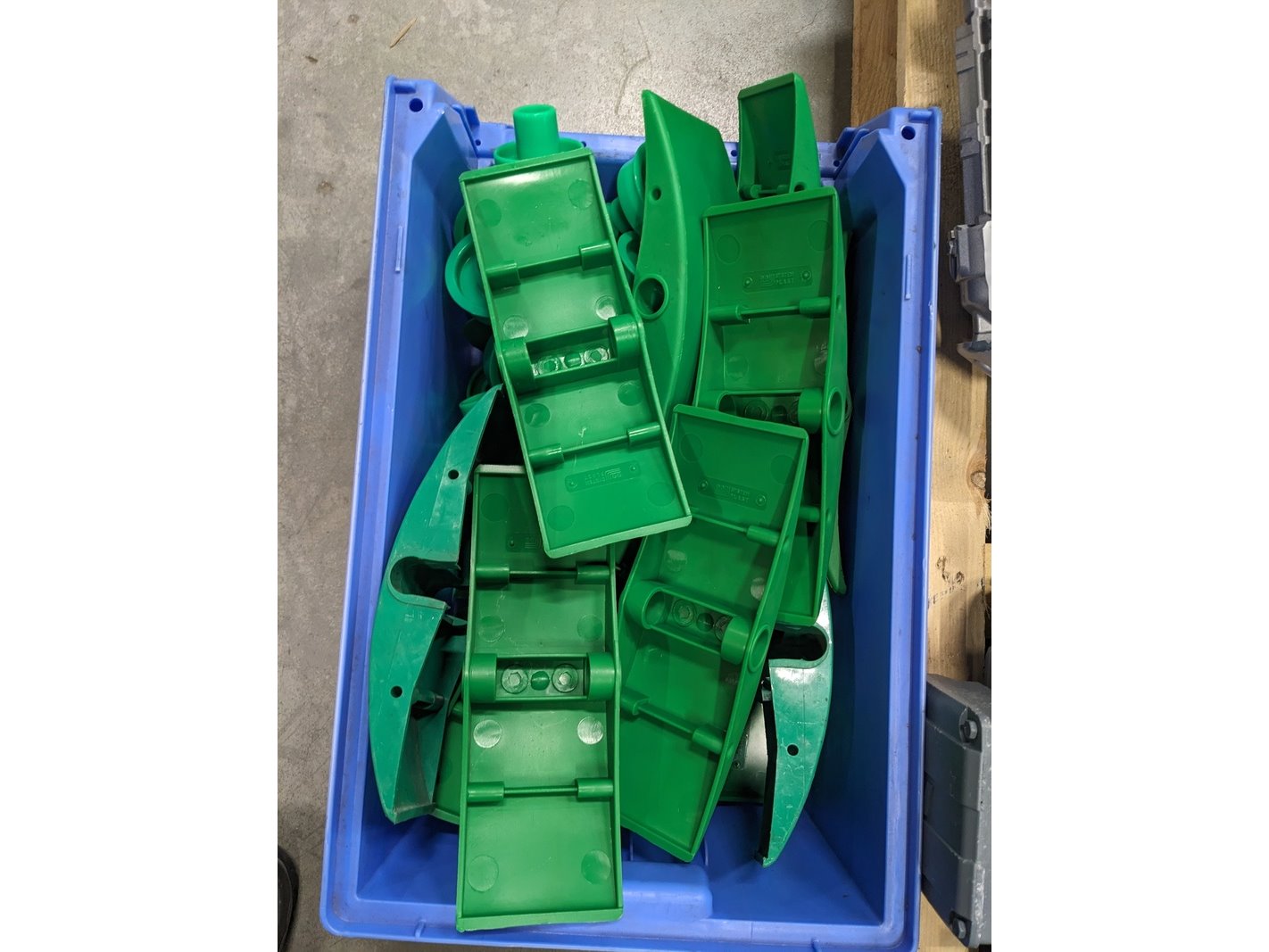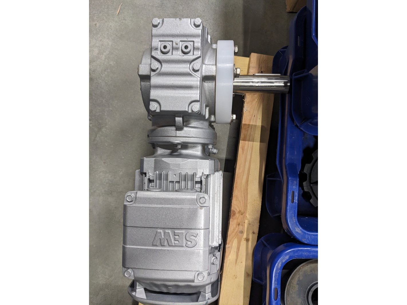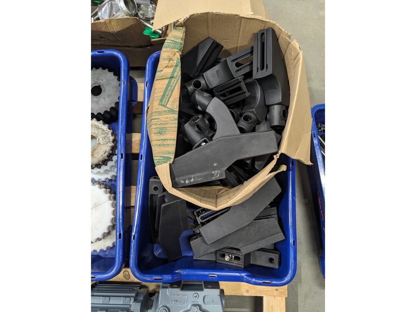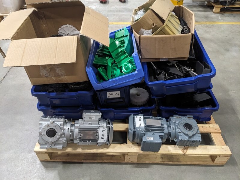 Merk: Polyketting Product: Partij reserve delen Materiaal: kunststof / RVS Conditie: nieuw Specificaties: 1 pallet met circa 8 dozen/kisten ongebruikte onderdelen voor transportbanen, tandwielen, looprollen, glijstukken, zijgeleiders, steunen, 2x aandrijfmotor met reductor SEW Eurodrive SA47 DRN 80MK4 ongebruikt