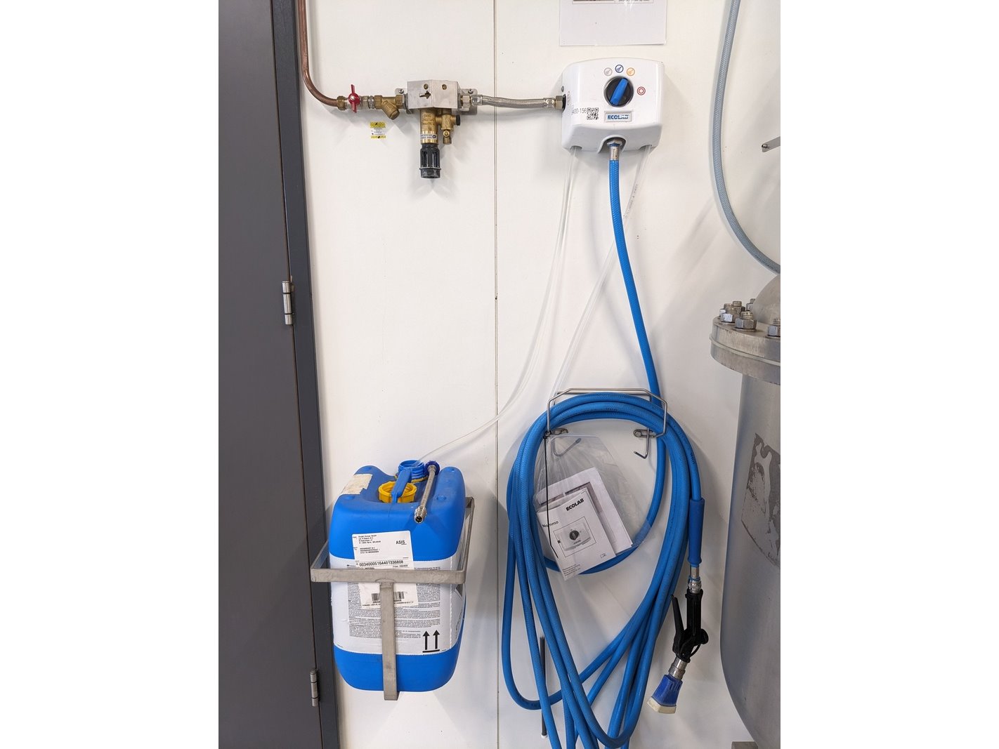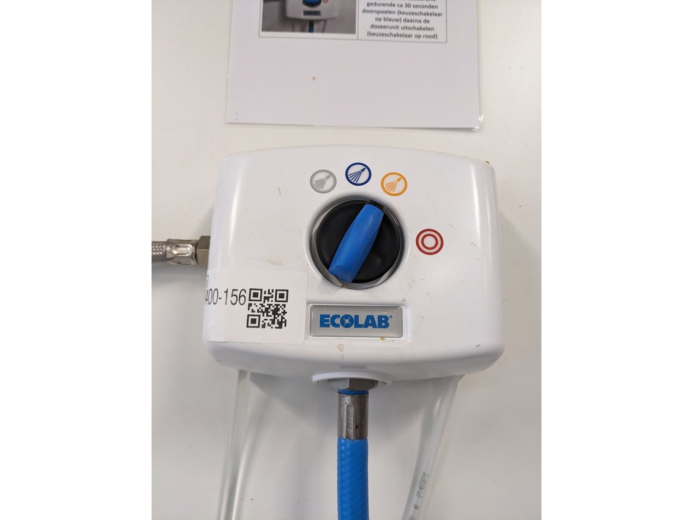 Merk: Nommo Product: Doseerunit schuimreiniger Kleur: blauw/wit Specificaties: Voor het desinfecteren van oppervlakten en onderdelen, uitgevoerd met terugslagklep, reduceerventiel, circa 15 meter slang met spuit nozzle en toebehoren, 1 vat Ecolab P3 topax 66 reinigingsmiddel (ca 15 liter)