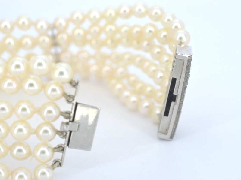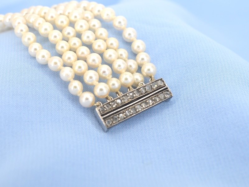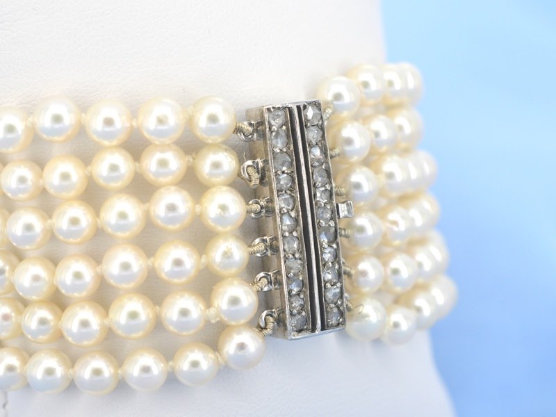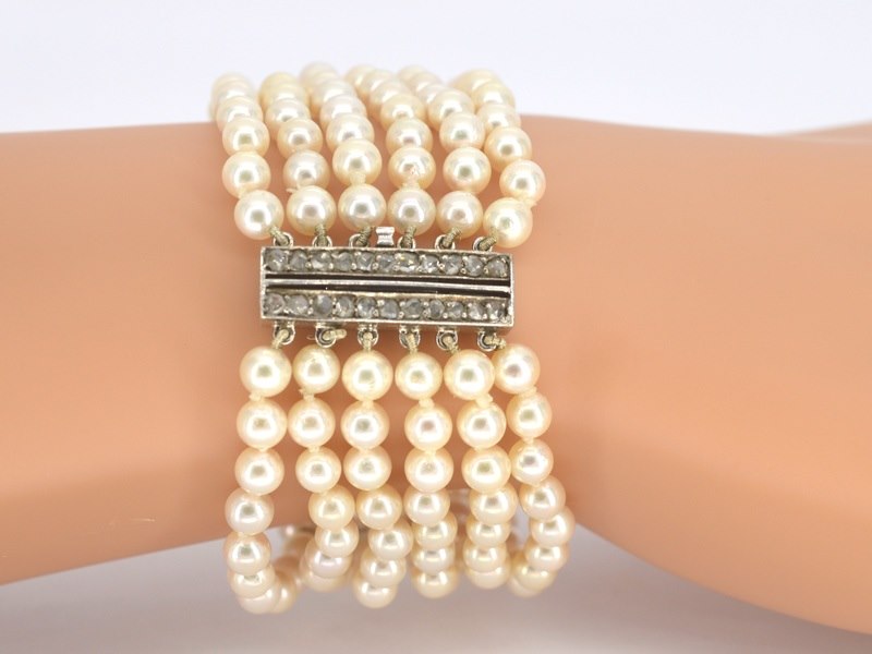 Product: Parelarmband met platina slot met diamanten Specificaties: Diamant: Natuurlijk Aantal: 22 stuks Slijpvorm: Roos geslepen Gewicht (carat): 0.50 carat Kleur: F-G Zuiverheid: VS-SI Slijpkwaliteit: Goed Parel: Parel Aantal stuks: 180 stuks Kleur: Wit Afmeting: 5 mm Luster: Glanzend Kwaliteit: AAA Juweel: Armband Gewicht: 34 gram Afmetingen/lengte: 17 cm Materiaal: Platina Conditie: Vintage Verpakking: Luxe sieradendoos Toelichting: De kwaliteit is overgenomen van het rapport behorend bij item. De waardebepaling is een beoordeling van een gecertificeerde diamantair, gebaseerd op consumentenprijzen. Consumentenprijs: € 8.000,-