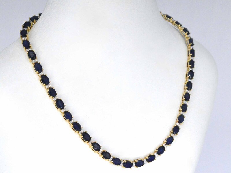 Product: Geelgouden collier met diamanten en saffier Specificaties: Diamant: Natuurlijk Aantal: 124 stuks Slijpvorm: Briljant geslepen Gewicht (carat): 1.50 carat Kleur: F-G Zuiverheid: SI-P Slijpkwaliteit: Zeer mooi Edelsteen: Saffier Slijpvorm: Druppel vorm Gewicht (carat): 35.00 carat Kleur: Blauw Zuiverheid: Met natuurlijke insluitsels Slijpkwaliteit: Very good Juweel: Halsketting Gewicht: 26 gram Afmetingen/lengte: 46 cm Materiaal: 14 karaat (585) Conditie: Nieuw Verpakking: Luxe sieradendoos Toelichting: De kwaliteit is overgenomen van het rapport behorend bij item. De waardebepaling is een beoordeling van een gecertificeerde diamantair, gebaseerd op consumentenprijzen. Consumentenprijs: € 19.250,-