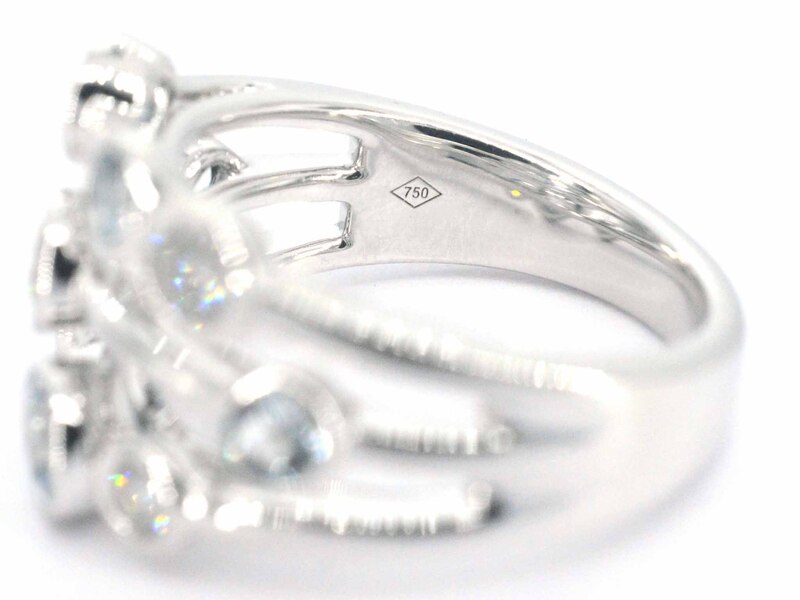 Product: Witgouden design ring met aquamarijn en diamant Specificaties: Aantal: 4 stuks Slijpvorm: Briljant geslepen Gewicht (carat): 0.60 carat Kleur: F-G Zuiverheid: VS Slijpkwaliteit: Zeer mooi Edelsteen: Aquamarijn Aantal: 5 stuks Slijpvorm: Briljant geslepen Gewicht (carat): 0.75 carat Kleur: licht blauw Zuiverheid: Met natuurlijke insluitsels Juweel: Ring Gewicht: 8.6 gram Ringmaat (op maat gemaakt*): 53 (17 mm) Materiaal: 18K goud (750) Conditie: Nieuw Verpakking: Luxe sieradendoos Toelichting: De kwaliteit is overgenomen van het rapport behorend bij item. De waardebepaling is een beoordeling van een gecertificeerde diamantair, gebaseerd op consumentenprijzen. Consumentenprijs: € 8.733,-