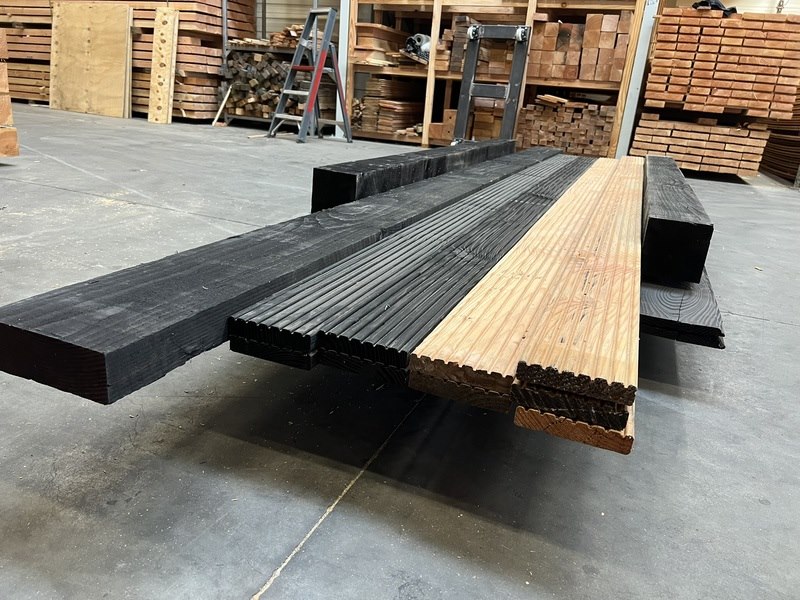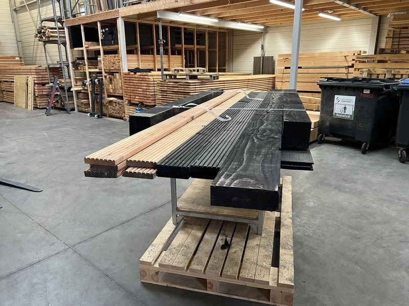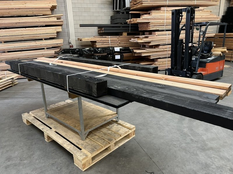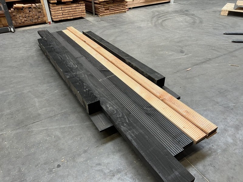 Product: Div. zwart en blank douglashout Materiaal: Douglas Specificaties: 2 st 150x150x2500mm zwart bezaagd 1 st 75x220x4500mm zwart bezaagd 4 st vlonderplank 28x145x4000mm zwart 5 st vlonderplank 28x145x4000mm blank douglas 10 st halfhoutprofiel 18x190x3000 zwart douglas