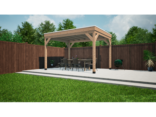 Merk: Verando Product: Douglas overkapping 300x400cm Materiaal: Douglas Conditie: nieuw Specificaties: Deze overkapping bestaat uit hoogwaardige, bezaagde, Europese, douglashouten onderdelen en wordt geleverd als een compleet pakket inclusief bevestigingsmaterialen en een duidelijke, stapsgewijze handleiding voor de montage. Specificaties: •Palen van 12 × 12 cm •Ringbalk van 5 × 15 cm (bij 400 cm diepte 7,5 x 17,5 cm) •Balklaag van 5 x 15 cm •Dakbeschot van 1,8 cm •Boeiboorden van 2,5 × 20 cm •Schoren van 5 × 15 cm •Bezaagd Europees douglas hout •Inclusief alle benodigde bevestigingsmaterialen •Heldere en gebruiksvriendelijke montagehandleiding De laatste afbeelding is ter illustratie van de houtkwaliteit.
