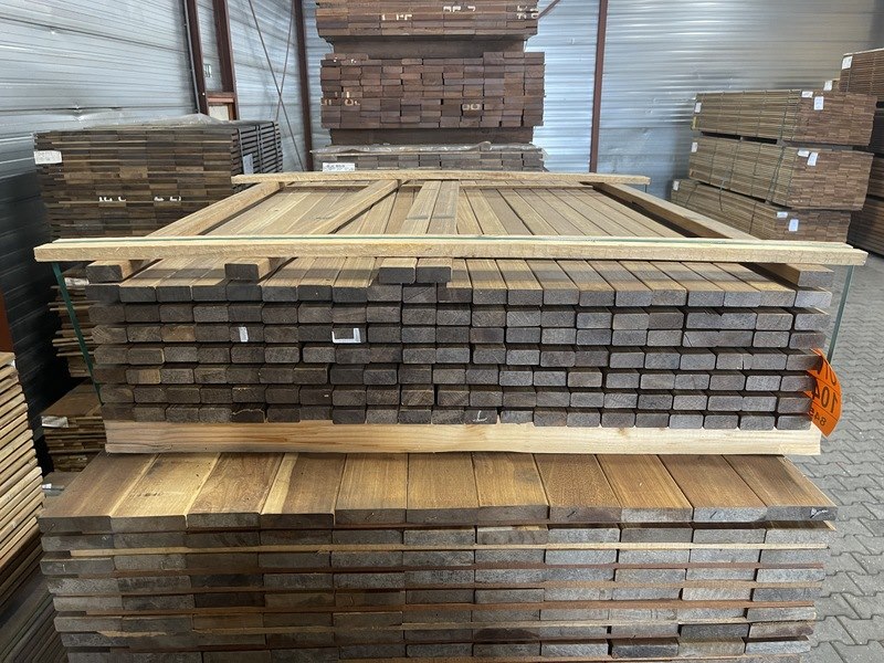 Product: Guyana Ipé Latten Geschaafd Materiaal: Djindja Udu Afmeting: 21x45mm, lengte 125cm Conditie: nieuw