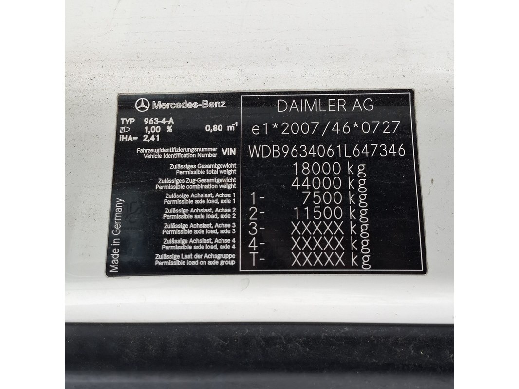 Merk: Mercedes-Benz Product: Vrachtwagen BouwJaar: 2012 Conditie: gebruikt Specificaties: Kenteken: Niet geregistreerd Eerste toelating nationaal: Niet geregistreerd APK vervaldatum: Onbekend Brandstof: Diesel Afgelezen tellerstand: 911.209km Transmissie: Automaat Aantal sleutels: 1 VIN nummer: WDB9634061L647346 Start: Ja, met booster i.v.m. lage accuspanning Opties en uitrusting Elektrische ramen en spiegels Cruisecontrol Radio/CD Airconditioning Waargenomen gebreken Diverse gebruikssporen rondom Volgens opgave diverse storingsmeldingen in het display Goedkeuring op basis van buitenlandse goedkeuring binnen de EU