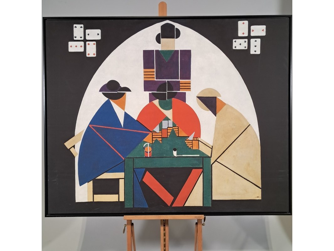 Drukwerk in lijst, reproductie van theo van doesburg, de kaartspelers