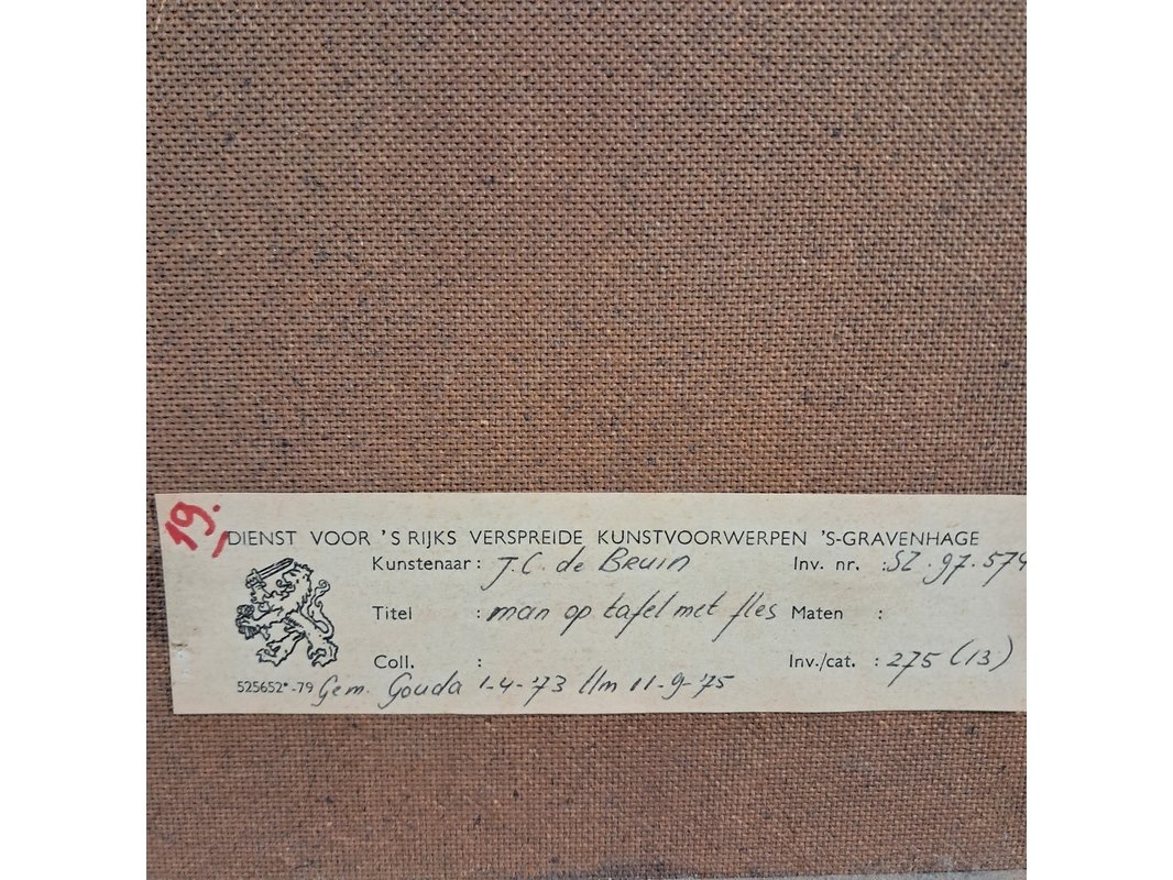 Schilderij, j. de bruin, man op tafel met fles