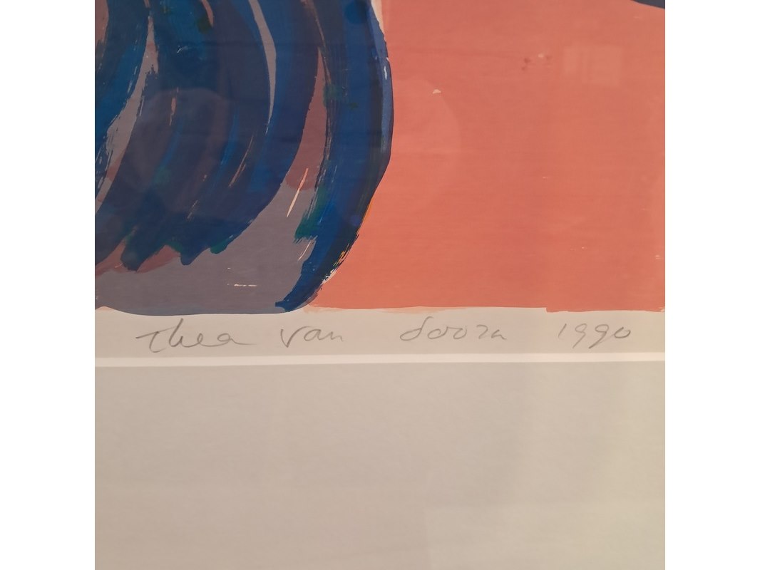 Merk: Thea van Doorn Product: Zeefdruk Afmeting: hxb ca. 71x83 cm BouwJaar: 1990 Specificaties: Glas gebroken.