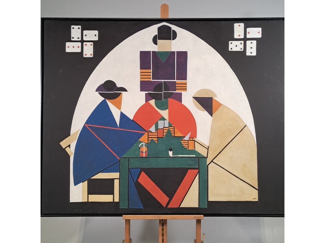 Drukwerk in lijst, reproductie van theo van doesburg, de kaartspelers