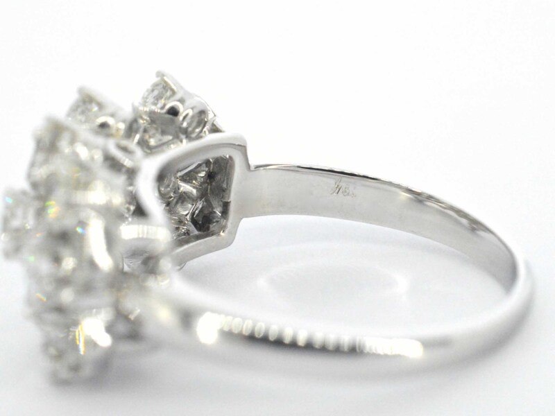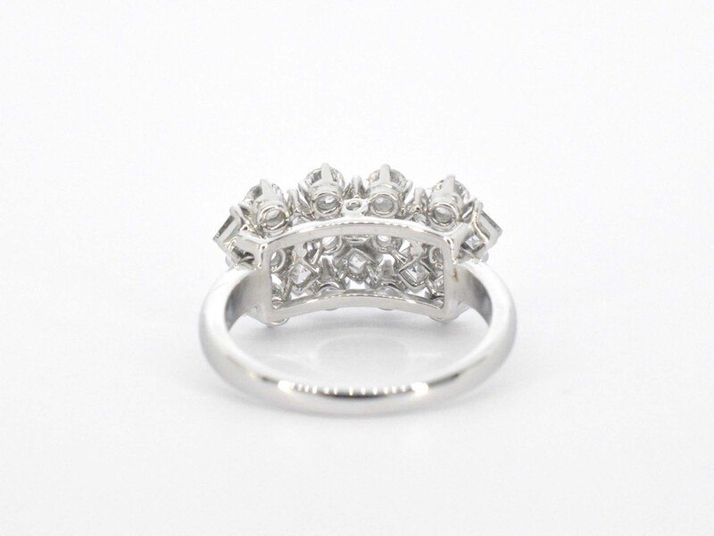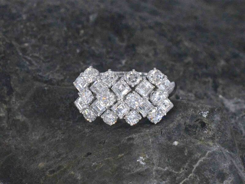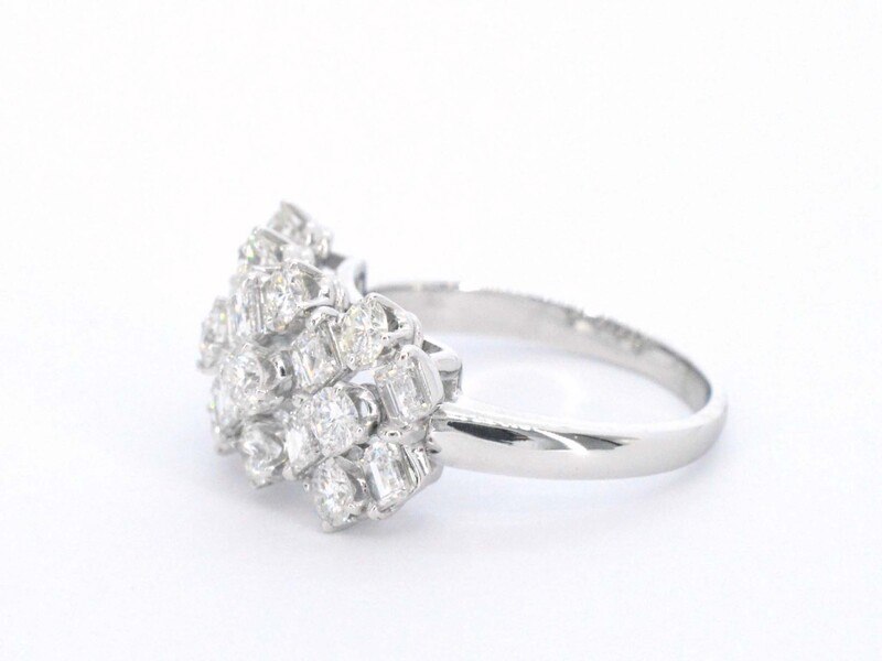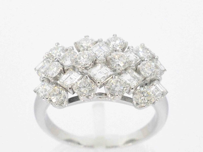 Product: Gouden ring met diamanten 2.70 carat Specificaties: Diamant: Natuurlijk Aantal: 12 stuks Slijpvorm: Briljant geslepen Gewicht (carat): 1.20 carat Kleur: F-G Zuiverheid: VS Slijpkwaliteit: Zeer mooi Diamant (secundair): Diamanten Aantal diamanten: 10 stuks Slijpvorm: Square geslepen Gewicht (carat): 1.50 carat Kleur: F-G Zuiverheid: VS Slijpkwaliteit: Zeer mooi Juweel: Ring Gewicht: 6.5 gram Ringmaat (op maat gemaakt*): 57 (18 mm) Materiaal: 18K goud (750) Conditie: Zo goed als nieuw Verpakking: Luxe sieradendoos Toelichting: De kwaliteit is overgenomen van het rapport behorend bij item. De waardebepaling is een beoordeling van een gecertificeerde diamantair, gebaseerd op consumentenprijzen. Consumentenprijs: € 15.400,-