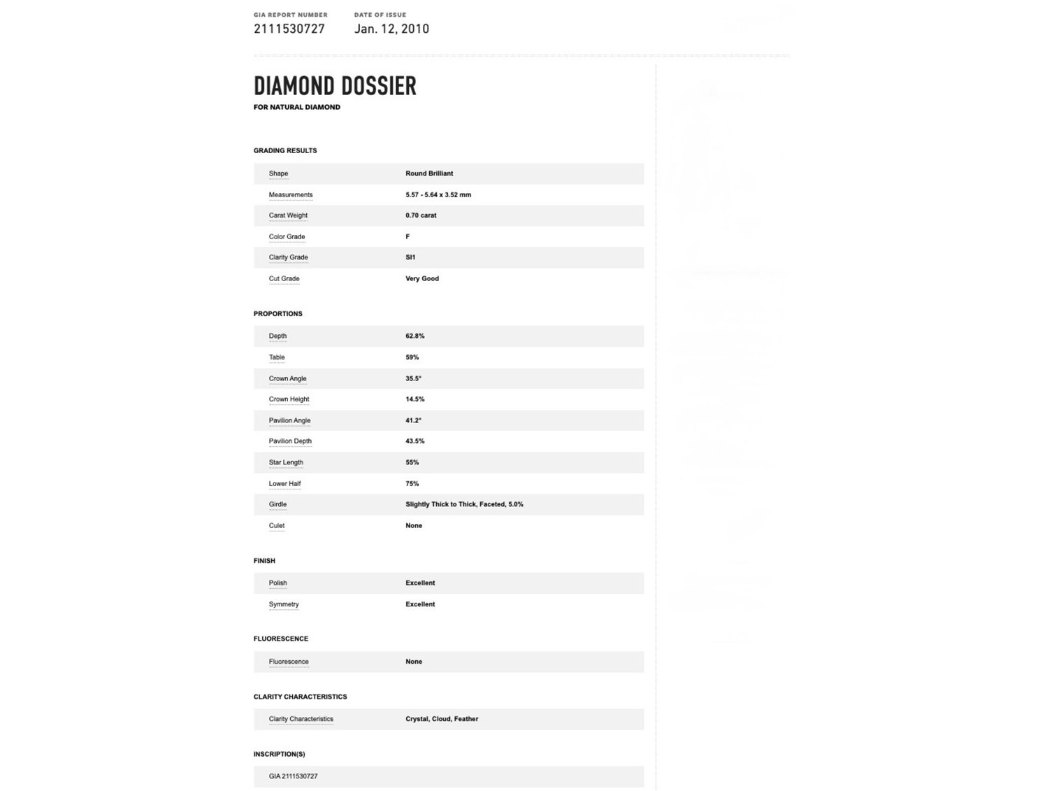 Product: Diamant - 0.70 carat natuurlijke briljant geslepen diamant Specificaties: Diamant: Natuurlijk Aantal: 1 stuk Slijpvorm: Briljant geslepen Gewicht (carat): 0.70 carat Kleur: F Zuiverheid: SI1 Slijpkwaliteit: Very good Certificaat: GIA Certificaat nummer: 2111530727 Conditie: Nieuw Verpakking: Edelsteendoos Toelichting: De kwaliteit is overgenomen van het rapport behorend bij item. De waardebepaling is een beoordeling van een gecertificeerde diamantair, gebaseerd op consumentenprijzen. Extra informatie: Met laser inscriptie in diamant en GIA uitdraai Consumentenprijs: € 6.600,-