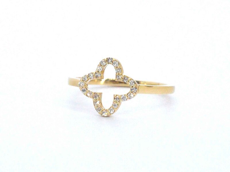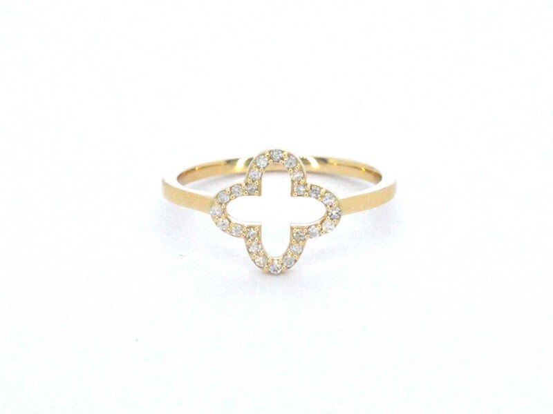 Product: Gouden ring met een open klaver vier motief gezet met diamanten Specificaties: Diamant: Natuurlijk Aantal: 24 stuks Slijpvorm: Rond geslepen Gewicht (carat): 0.15 carat Kleur: F-G Zuiverheid: SI-P Slijpkwaliteit: Zeer mooi Juweel: Ring Gewicht: 2 gram Ringmaat (op maat gemaakt*): 54 (17.25 mm) Materiaal: 14 karaat (585) Conditie: Nieuw Verpakking: Luxe sieradendoos Toelichting: De kwaliteit is overgenomen van het rapport behorend bij item. De waardebepaling is een beoordeling van een gecertificeerde diamantair, gebaseerd op consumentenprijzen. Consumentenprijs: € 1.085,-