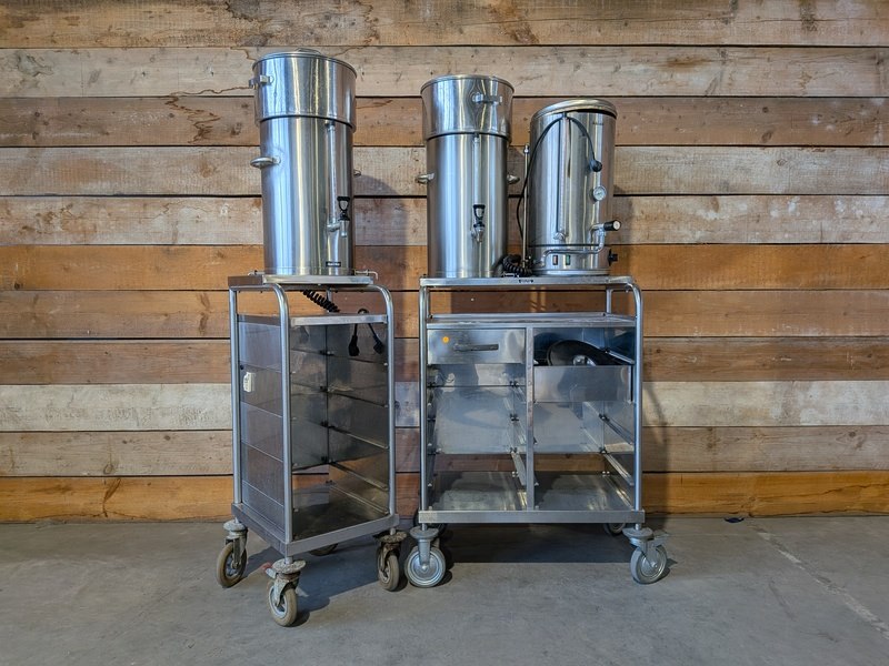 3x koffie- en/of drankencontainer op verrijdbare rvs-wagens, animo