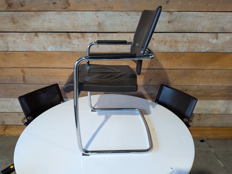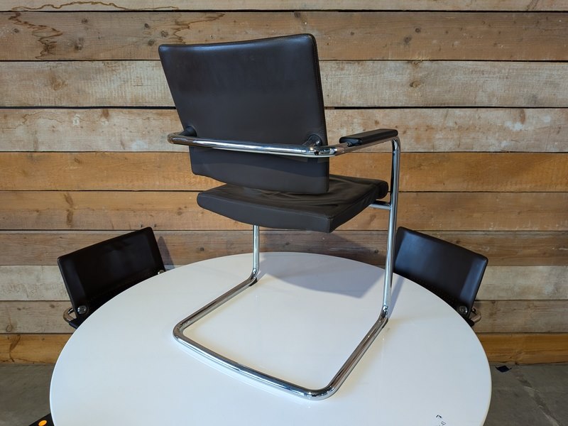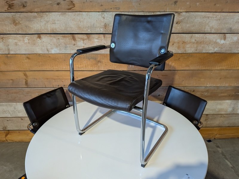 Merk: Mpiù Product: stoel in lederlook BouwJaar: 2010 Conditie: Gebruikt Specificaties: Afmetingen Tafel (HxØ) : ca. 705 x 1.300 mm Stoelen (zithoogte) : ca. 475 mm