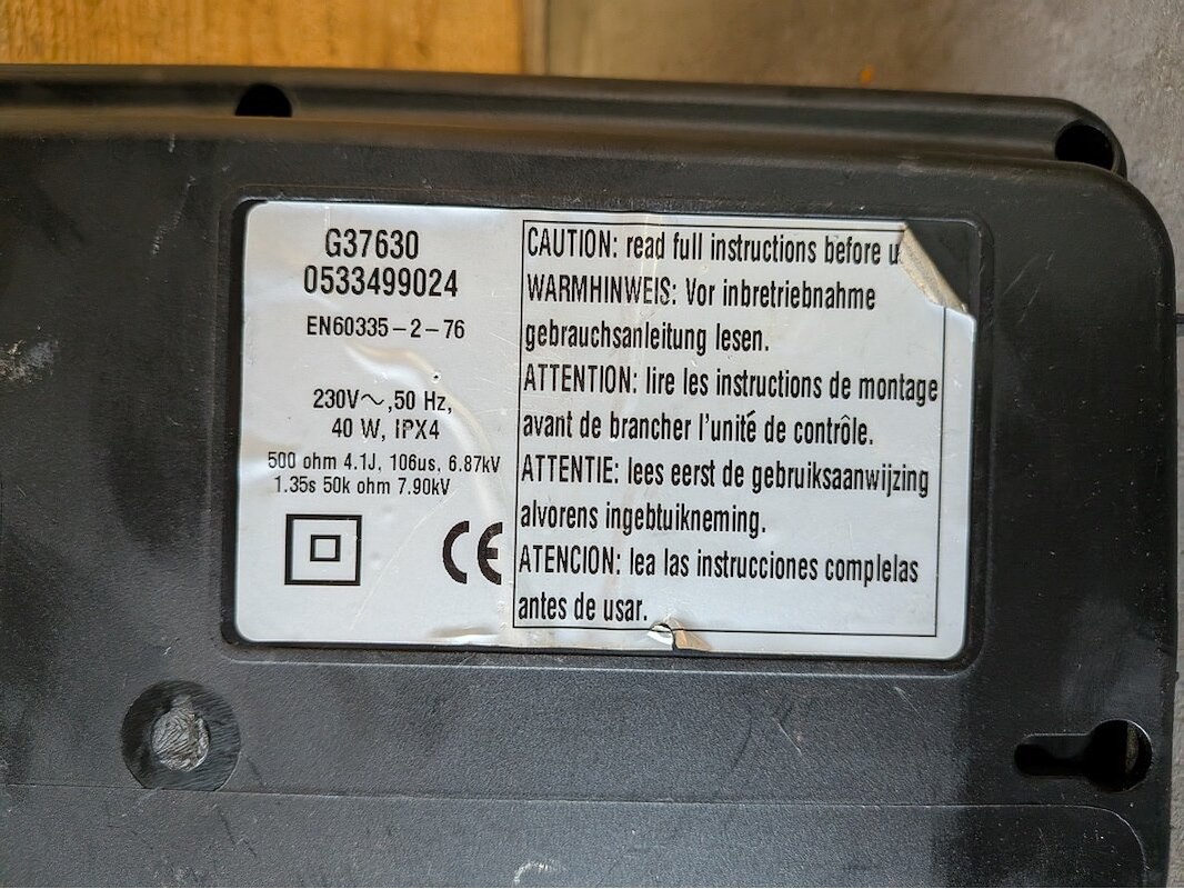 Merk: Gallagher Product: Schrikdraadapparaat Conditie: Gebruikt Specificaties: Technische gegevens Voeding: 230 V, 50 Hz Vermogen: 40 W Energie-output: Max. 0,5 joule Beschermingsklasse: IPX4 (spatwaterdicht) Het apparaat is bedoeld voor montage aan een muur en moet bij voorkeur binnenshuis of een beschutte plek worden geplaatst.