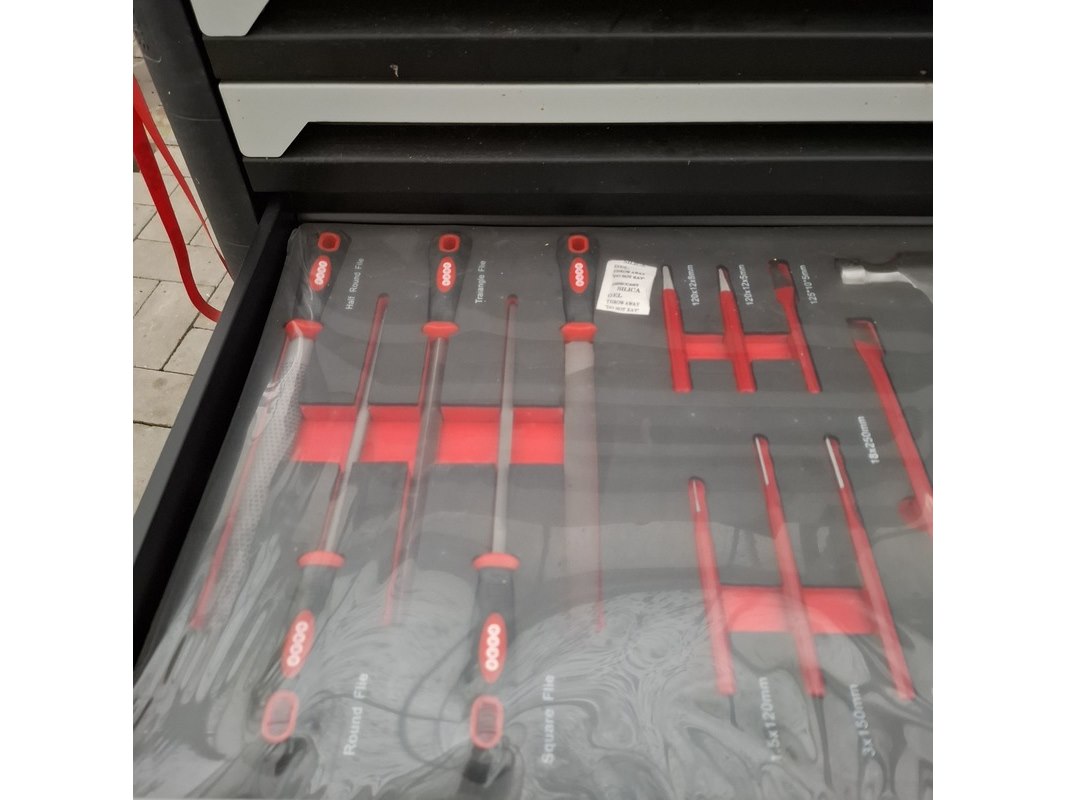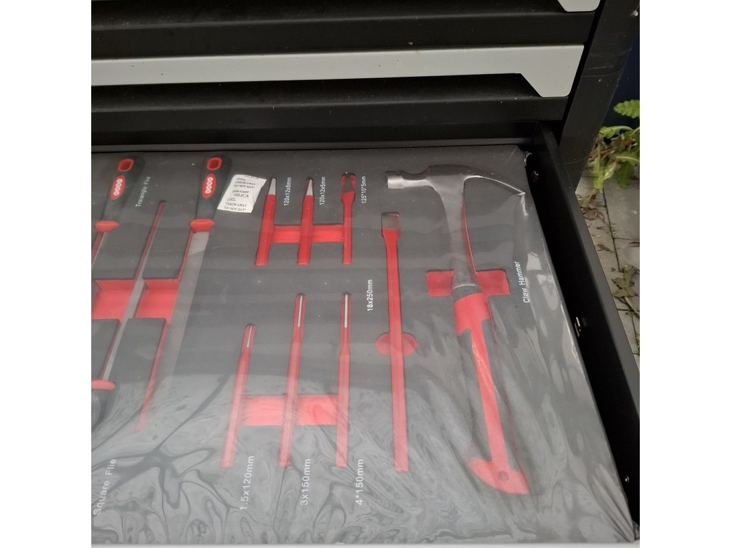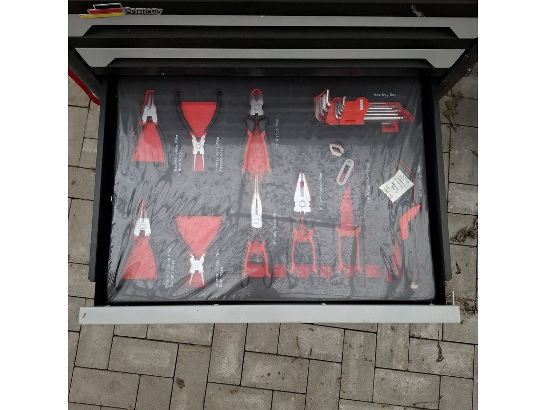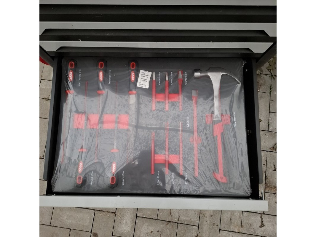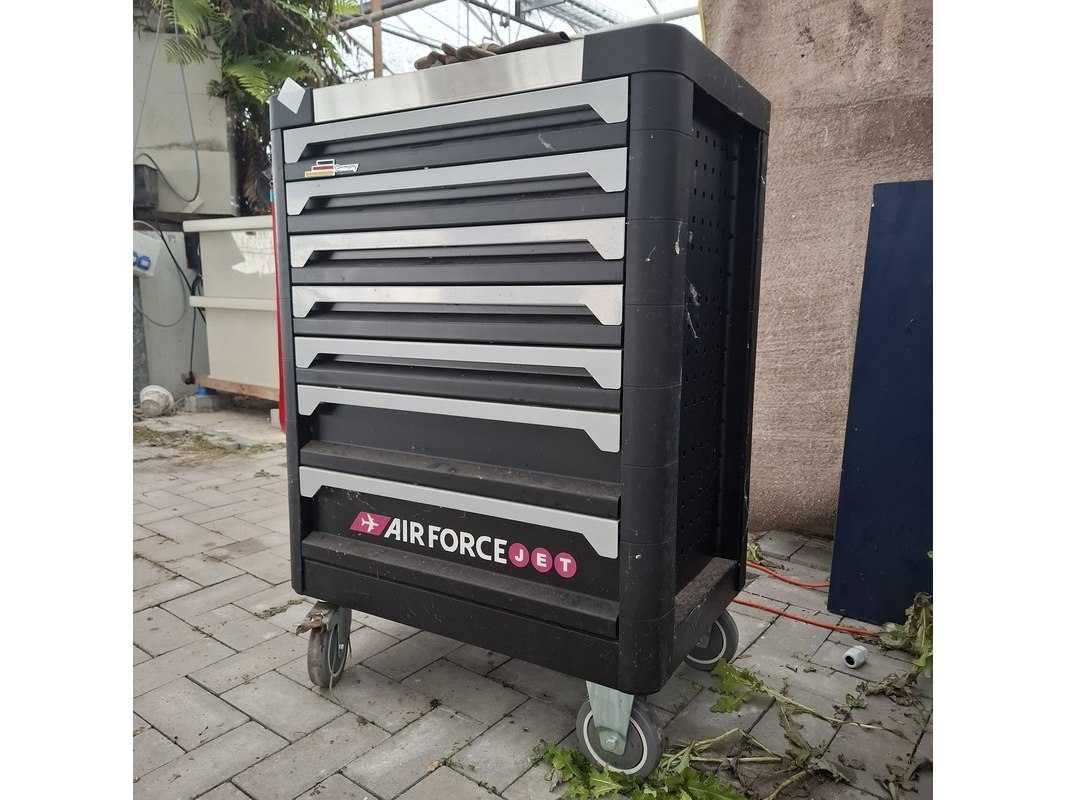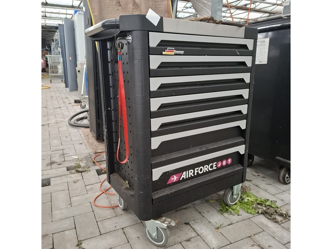 Merk: Airforce Jet Product: Gereedschapskar met inhoud Afmeting: lxbxh ca. 80x46x97 cm Specificaties: Inhoud bestaande uit o.a. Ring steeksleutels, schroevendraaier set, tangen, inbus sleutels, hamer en vijlen, torx sleutels