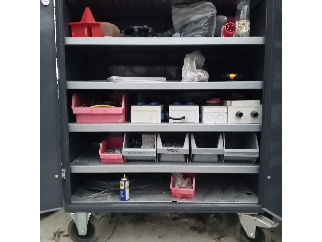Merk: Brinkman Special products Product: Verrijdbare werkplaatskast met inhoud Afmeting: Hxbxd ca. 176x137x61 cm Specificaties: Inhoud bestaande uit o.a. Dymo labelprinter, schroevendraaiers, handzaag, slijpschijven, gatenzaag, tape, handveger, tyraps, verdeelkast, etc