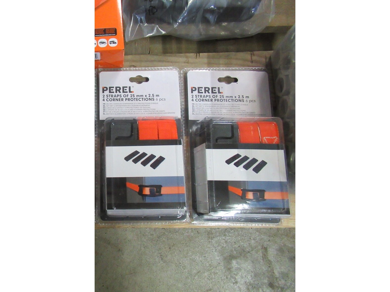 Merk: Perel Product: Set Spanbanden Conditie: nieuw Specificaties: Per set met 2 spanbanden en elk 4 hoekbeschermers