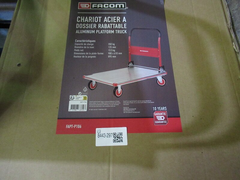 Merk: Facom Product: Plateauwagen Afmeting: ca. 90x61 cm Conditie: nieuw Specificaties: 350 Kg Laadvermogen, Inklapbaar, 4-wielige industriële zwenkwielen.