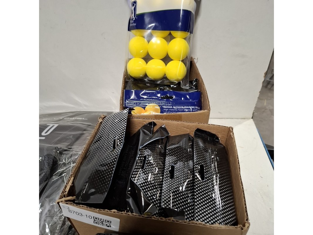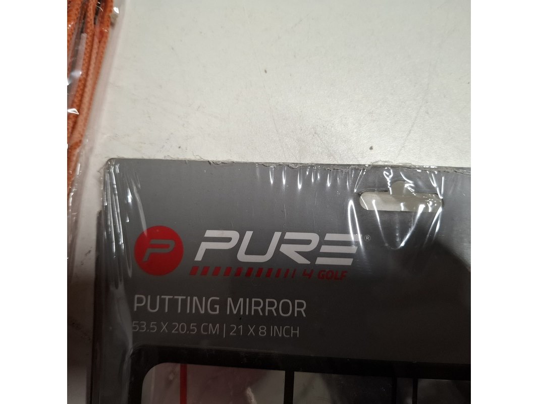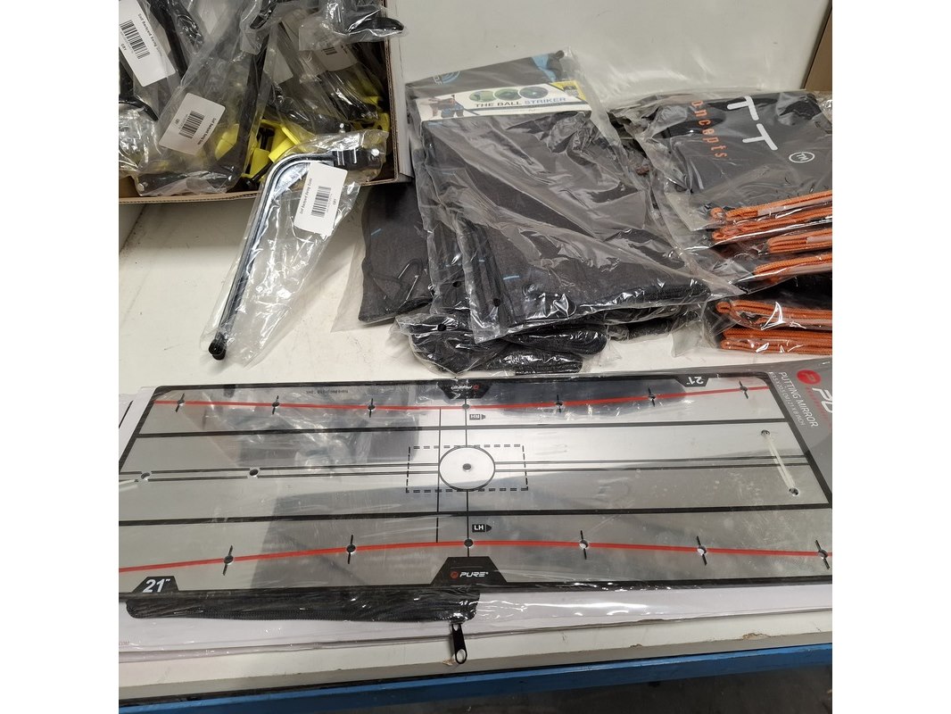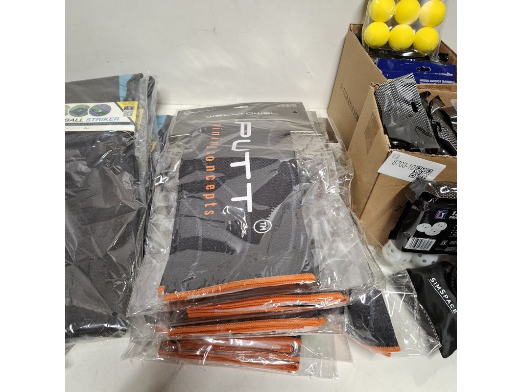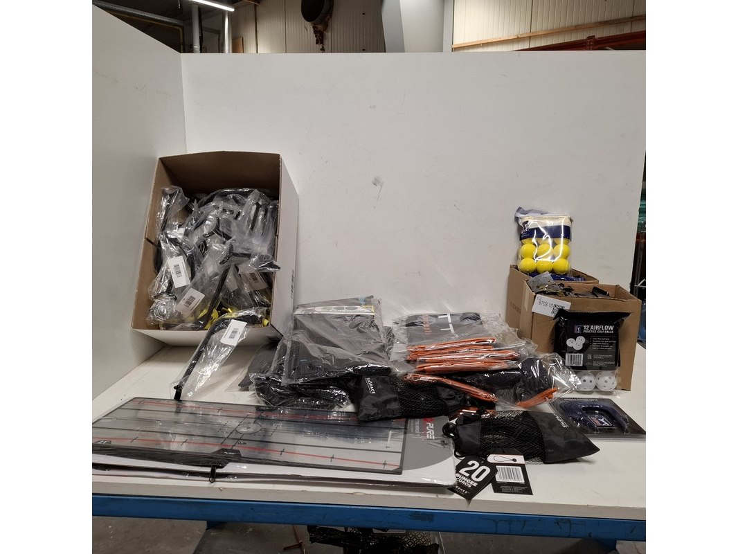 Product: Assortiment golf accessoires Conditie: nieuw Specificaties: bestaande uit o.a. : airflow oefen golf ballen, putt trainings doek, putt poortjes, balslager uitlijndoek, putting spiegels, backswing guide, verstelbare tees