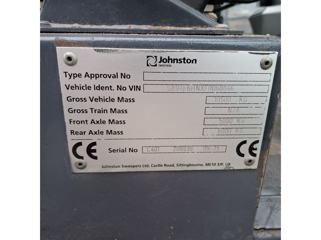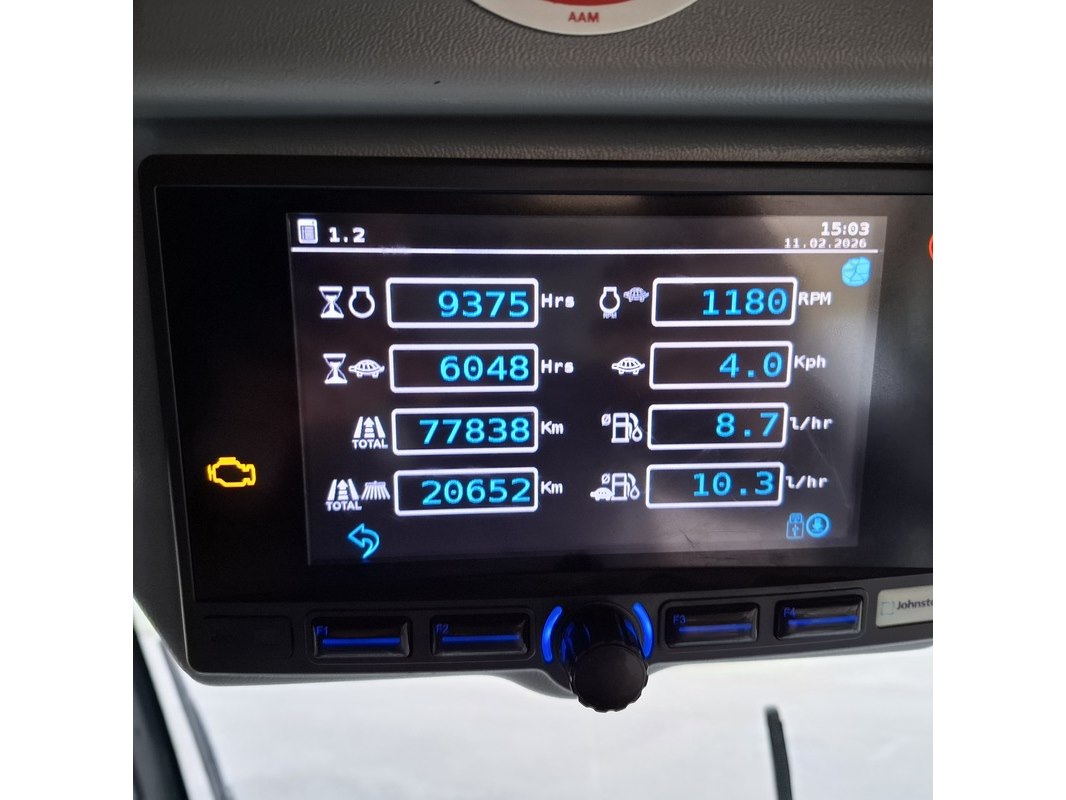Merk: Johnston Sweepers Product: Veegmachine met 3-delige borstel BouwJaar: 2015 Conditie: Gebruikt Specificaties: Kenteken: THV-80-N Datum eerste toelating: 30 juni 2015 VIN: SA9F6HNXF0068846 Chassisnummer: C401 206538 09-15 Voertuigomschrijving: Stratenreinigingmachine Brandstof: Diesel Afgelezen urenstand 1: 9375H Afgelezen urenstand 2: 6048H Afgelezen tellerstand: 77838 km Afgelezen tellerstand: 20652 km Opties & Accessoires - Camera met monitor - Middenarmleuning - Euro 6 - Waarschuwingslichten - Radio - 4 wiel besturing