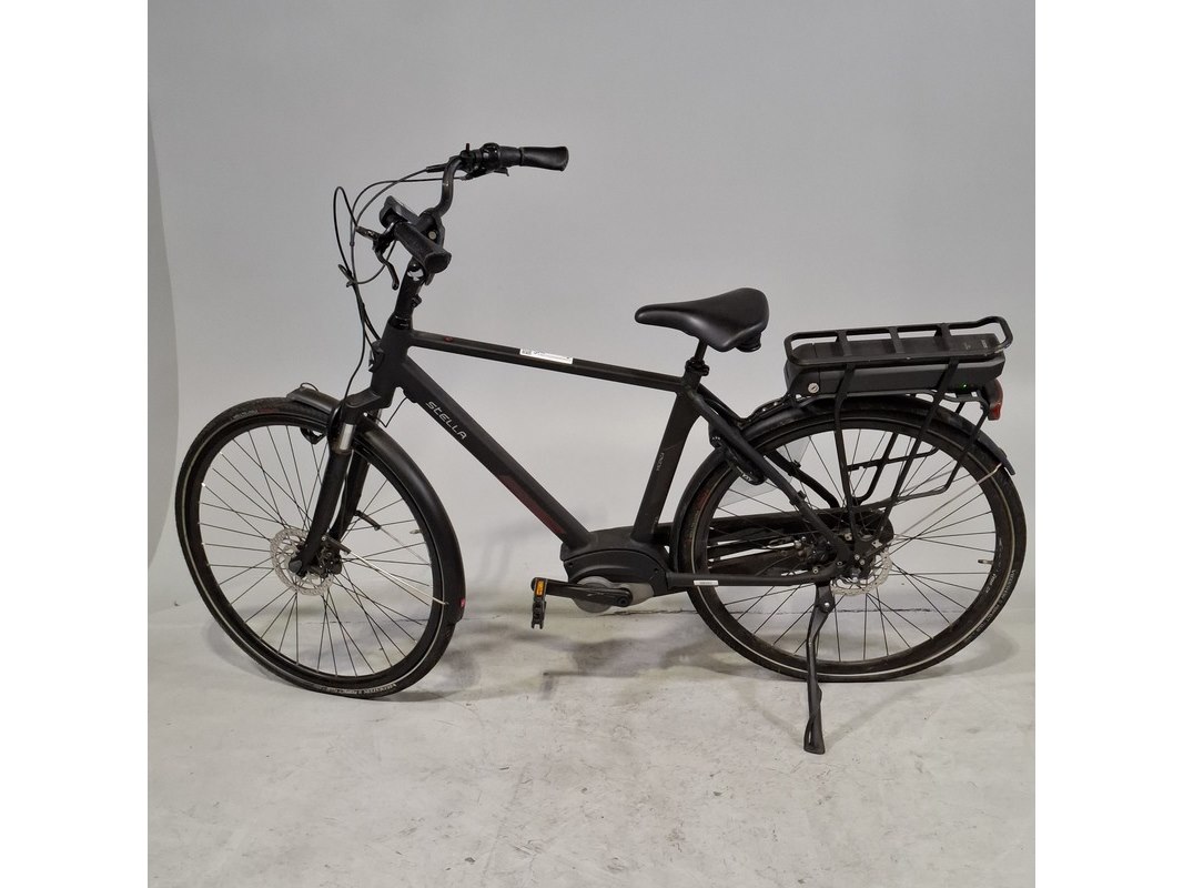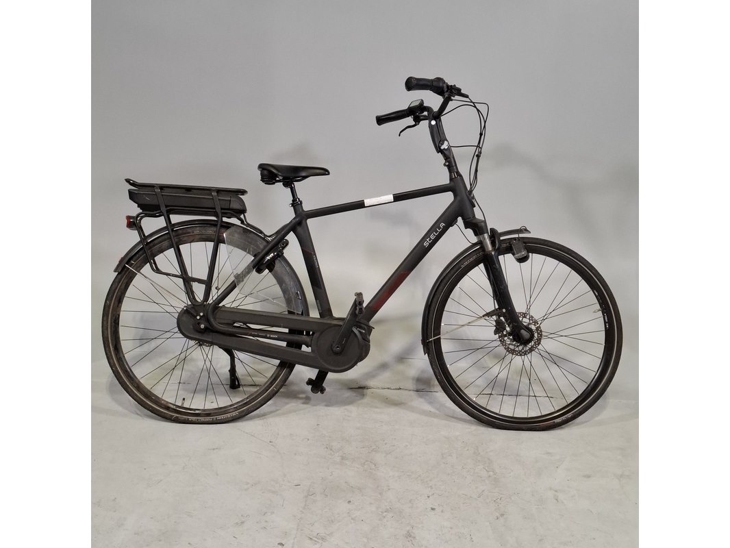 Merk: Stella Product: Elektrische herenfiets Afmeting: Framemaat ca. Conditie: gebruikt Specificaties: Geveerde voorvork 7 versnellingen Inclusief fietscomputer en accu. Afgelezen tellerstand 5077. Sleutels ontbreken: Accu staat op slot. Exclusief acculader. Spatbord voor gebroken, koplamp hangt los.