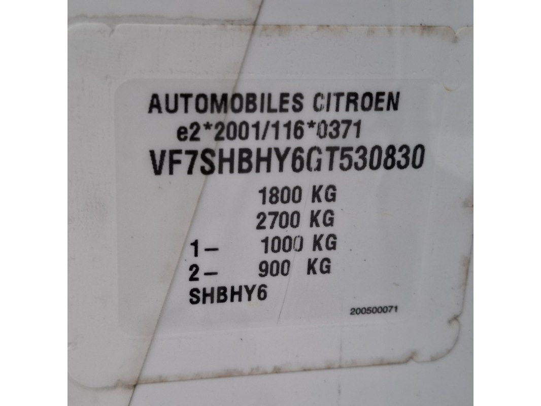 Merk: Citroën Product: Personenauto BouwJaar: 2016 Conditie: gebruikt Specificaties: Kenteken: niet geregistreerd Eerste toelating nationaal: niet geregistreerd APK vervaldatum: onbekend Brandstof: diesel Transmissie: handgeschakeld, 5 versnellingen Afgelezen tellerstand: 178.487 Aantal sleutels: 1 VIN nummer: VF7SHBHY6GT530830 Start: ja Opties e.d. Elektrische ramen en spiegels Cruisecontrol Airconditioning Radio/navigatie/CD Waargenomen gebreken Gebruikssporen rondom