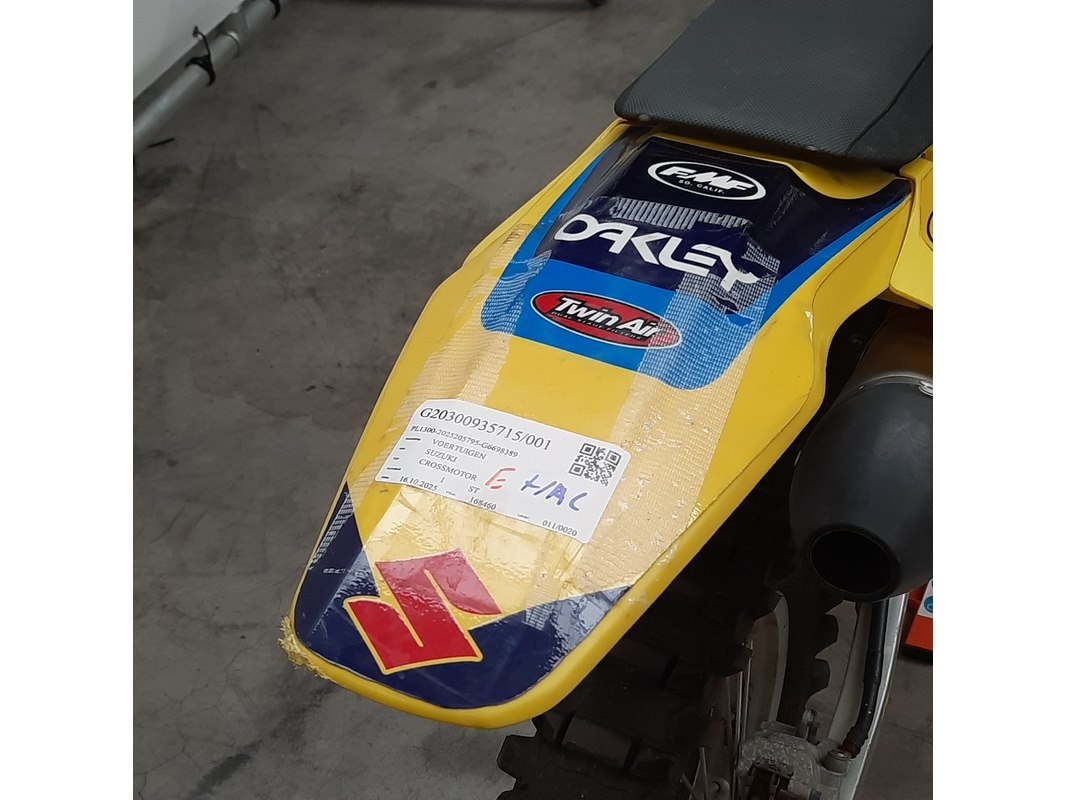 Merk: Suzuki Product: Crossmotor Conditie: gebruikt Specificaties: Kenteken: Niet geregistreerd Eerste toelating nationaal: Onbekend Brandstof: Benzine Afgelezen tellerstand: Onbekend Aantal sleutels: 0 VIN: JS1RJ41A000505868 Start: Nee Waargenomen gebreken Diverse gebruikssporen rondom Voertuig niet voor de openbare weg. Kan enkel worden toegelaten als individuele toelating via RDW Lelystad daarnaast is herinslag van het voertuigidentificatienummer (VIN) noodzakelijk. Domeinenrapport Bewijs van eigendom aanwezig.