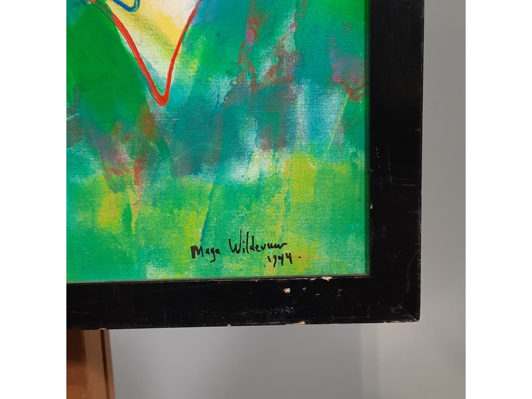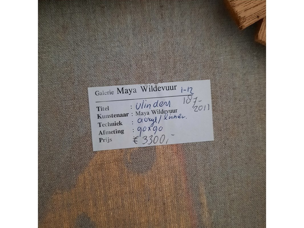 Merk: Maya Wildevuur Product: Acryl schilderij Afmeting: HxB ca. 95x95 cm. BouwJaar: 1994 Conditie: gebruikt