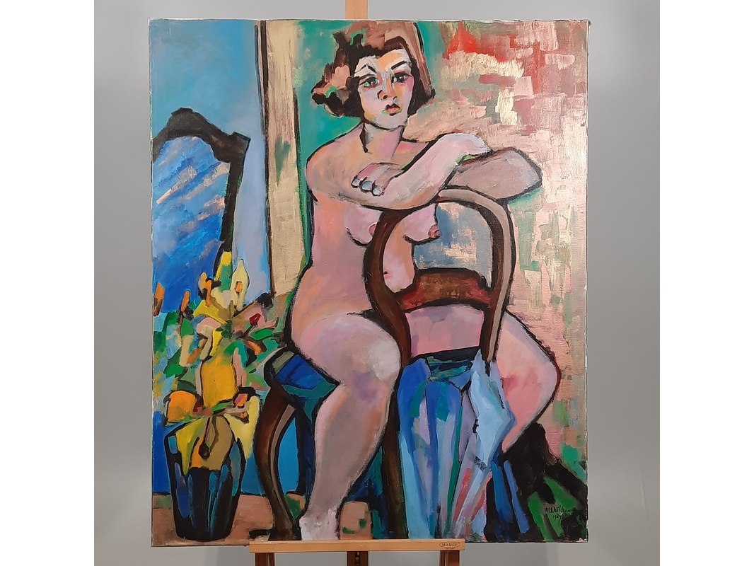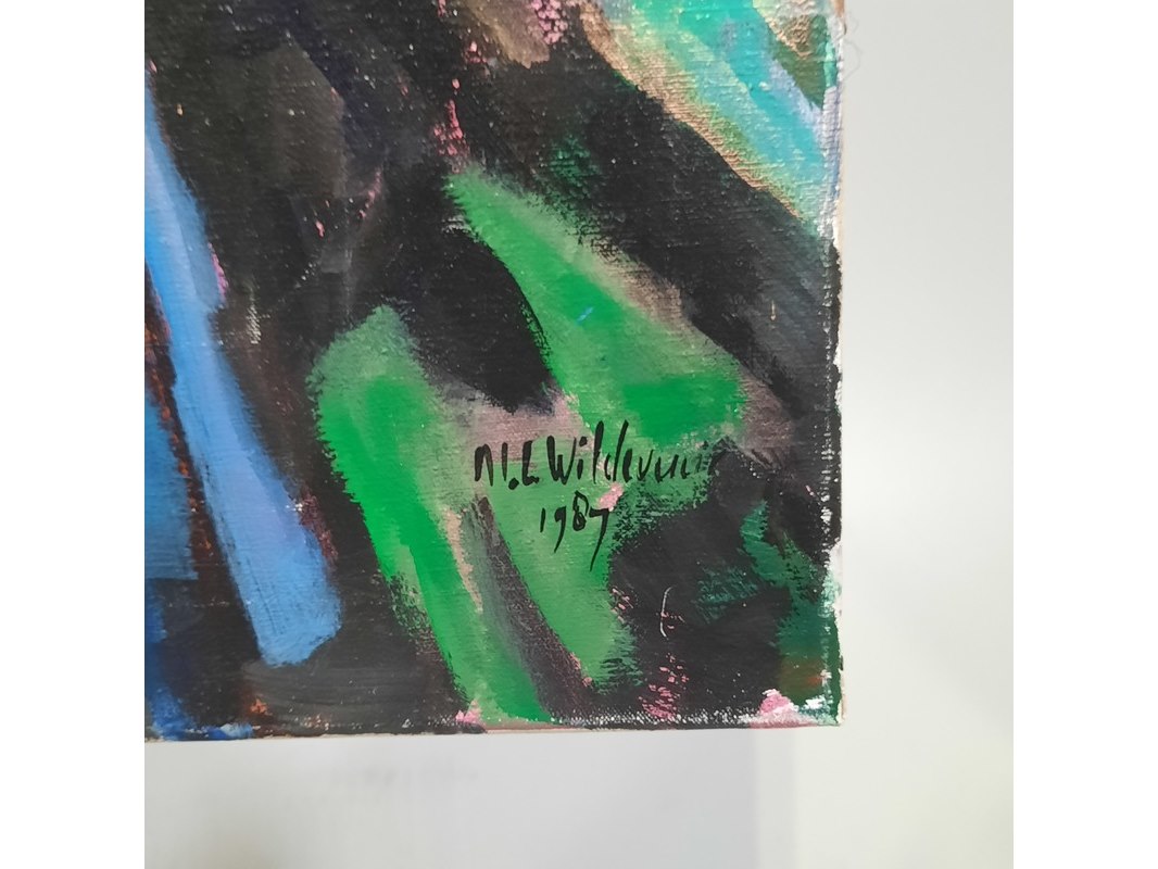 Merk: Maya Wildevuur Product: Acryl schilderij Afmeting: HxB ca. 120x100 cm. BouwJaar: 1989 Conditie: gebruikt Specificaties: Beschadigd op hoek