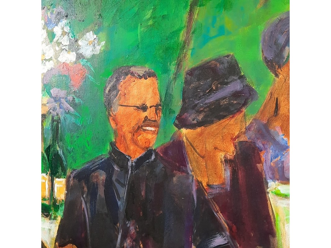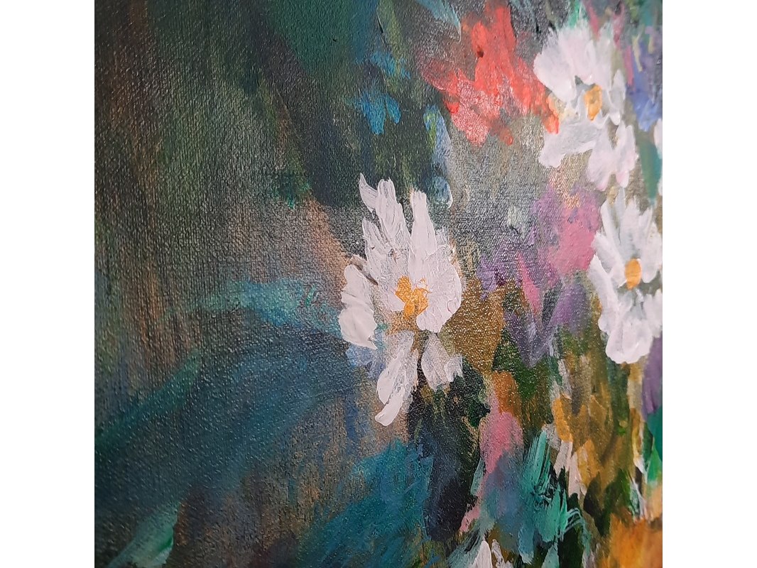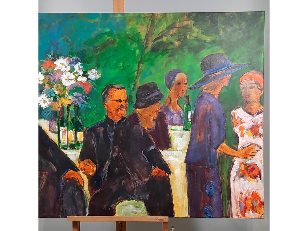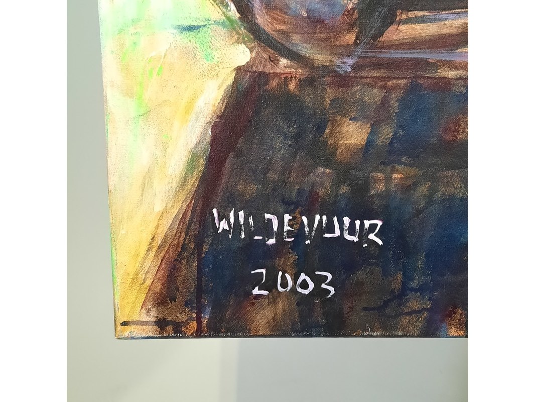 Merk: Maya Wildevuur Product: Acryl schilderij Afmeting: HxB ca. 100x140 cm. BouwJaar: 2003 Conditie: gebruikt