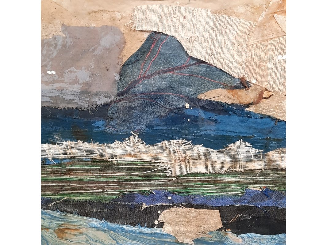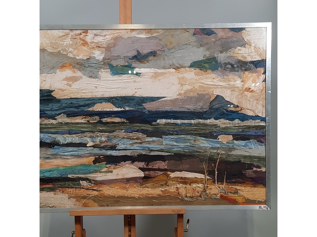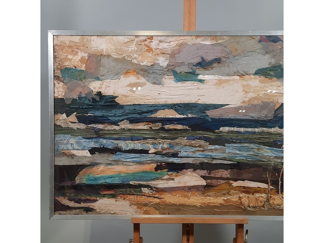 Merk: Maya Wildevuur Product: Kunstwerk, zijde collage Afmeting: HxB ca. 80x121 cm. Conditie: gebruikt