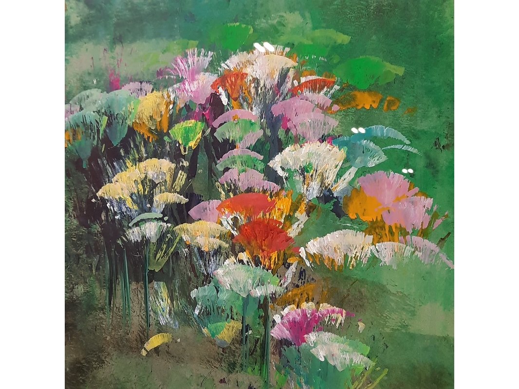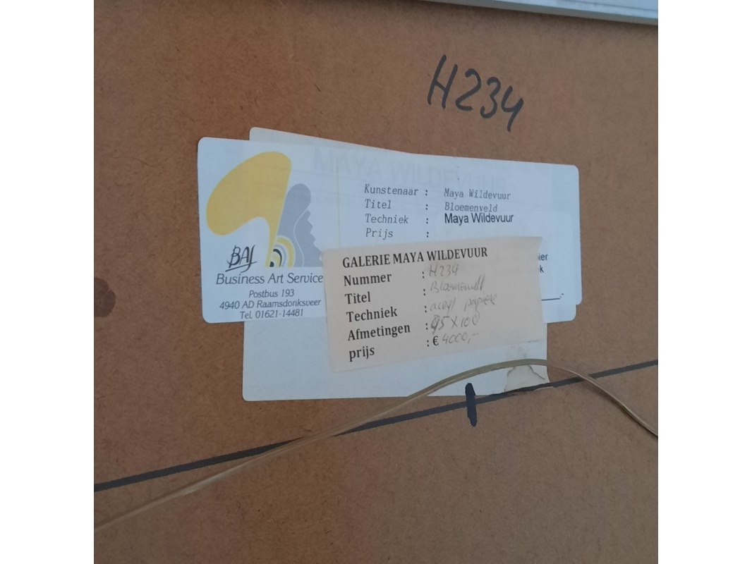 Kunstwerk, acryl op papier, maya wildevuur, bloemenveld, 1991
