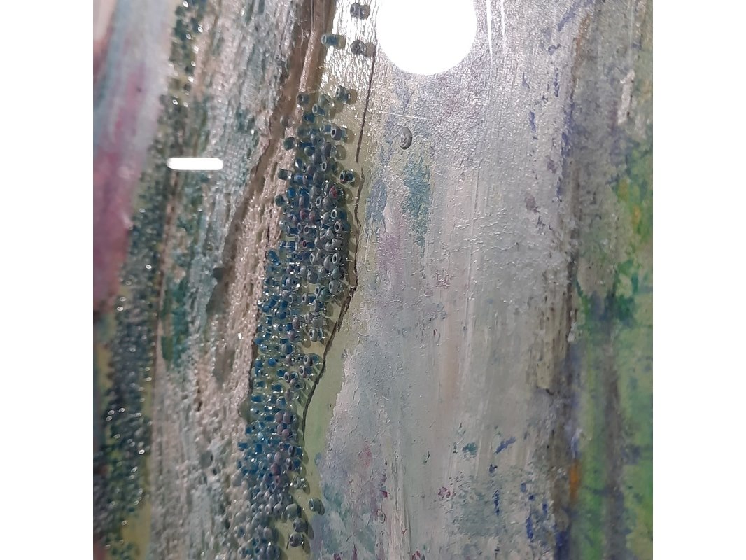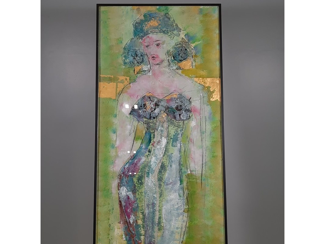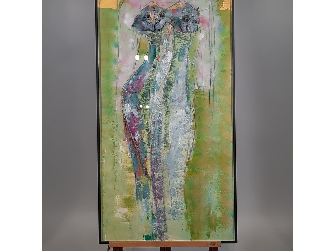 Merk: Maya Wildevuur Product: Kunstwerk, gemengde techniek Afmeting: HxB ca. 151x61 cm. BouwJaar: 1990 Conditie: gebruikt