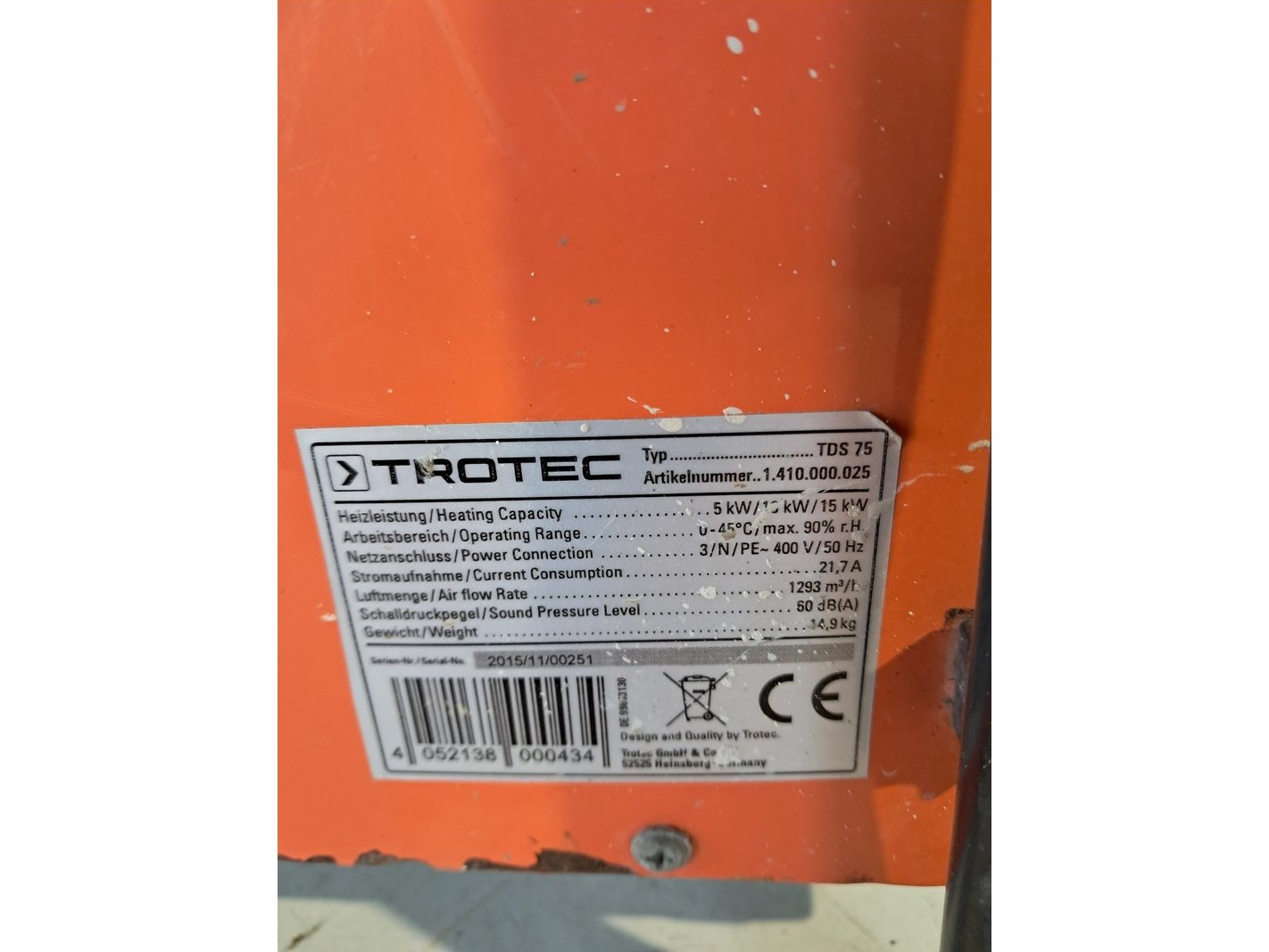 Elektroheater 15kw 400v trotec, tds 75, bouwjaar 2016