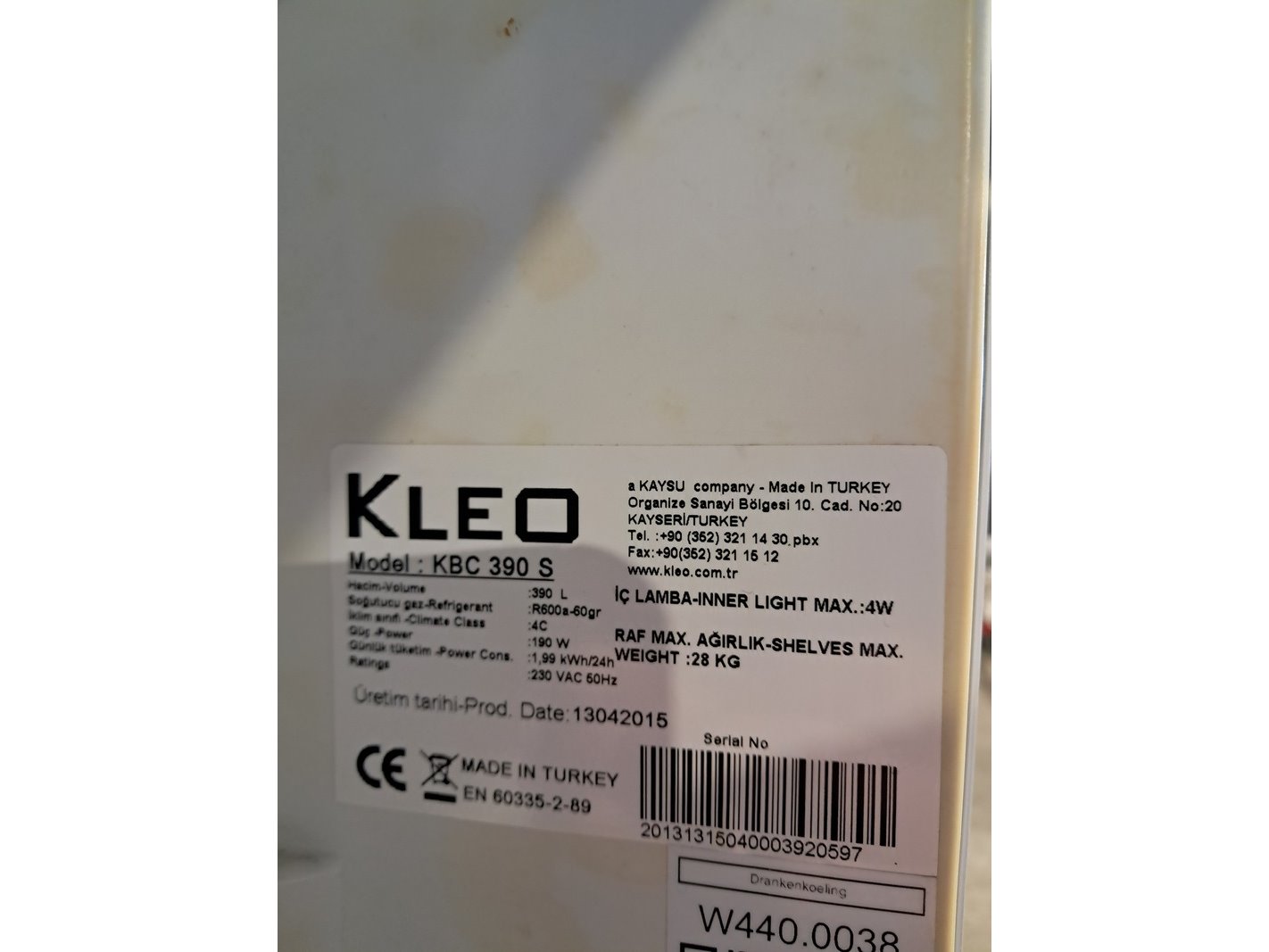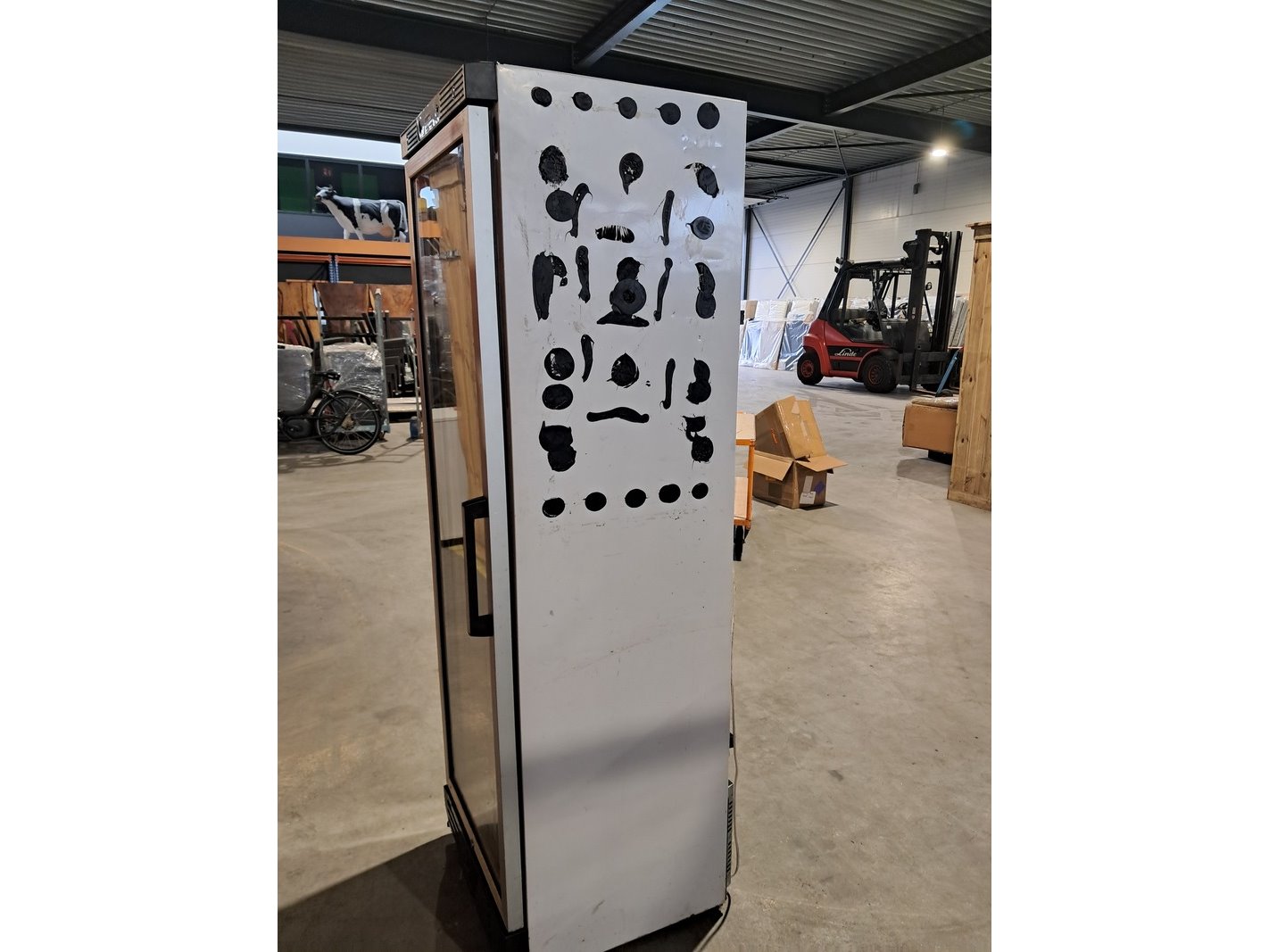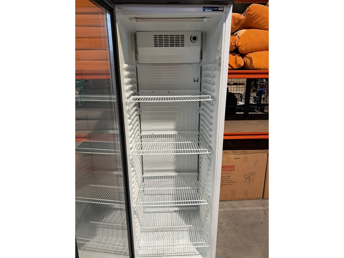 Merk: Kleo Product: Koelkast met glazen deur Afmeting: hxbxd ca. 188cm x 59cm x 59cm Conditie: Gebruikt Specificaties: Voltage: 230V Wattage: 190W Inhoud: 390L Serie Nr. 20131315040003920597