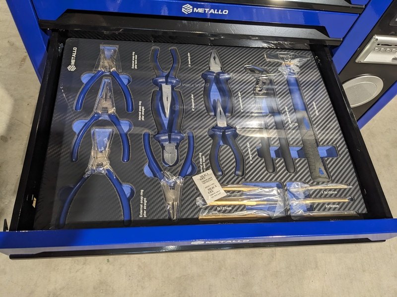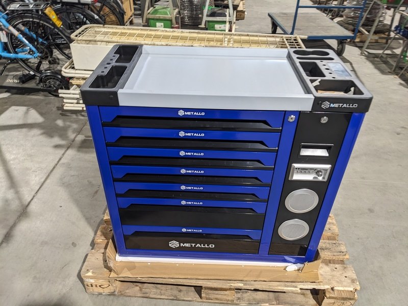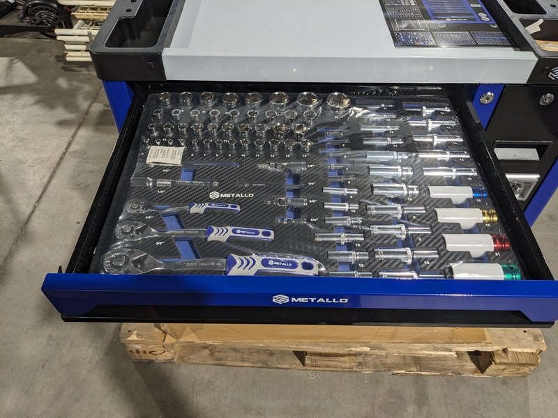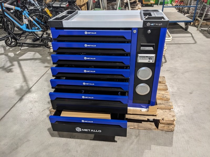 Merk: Metallo Product: Gereedschapswagen XXL Conditie: Nieuw Specificaties: - 6 Lades gevuld met gereedschap, 1 lege lade onderin waar de wielen in liggen en 1 lade aan de zijkant met ingebouwde radio - Momentsleutel 40-210 Nm - Krachtdoppen maat 8 - 32 - Zijdeur - Slot met sleutels - 2 Zwenkwielen met rem - Aluminium werkblad