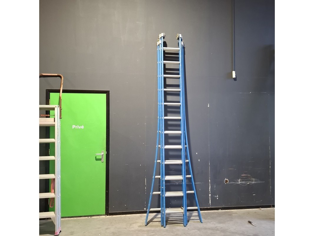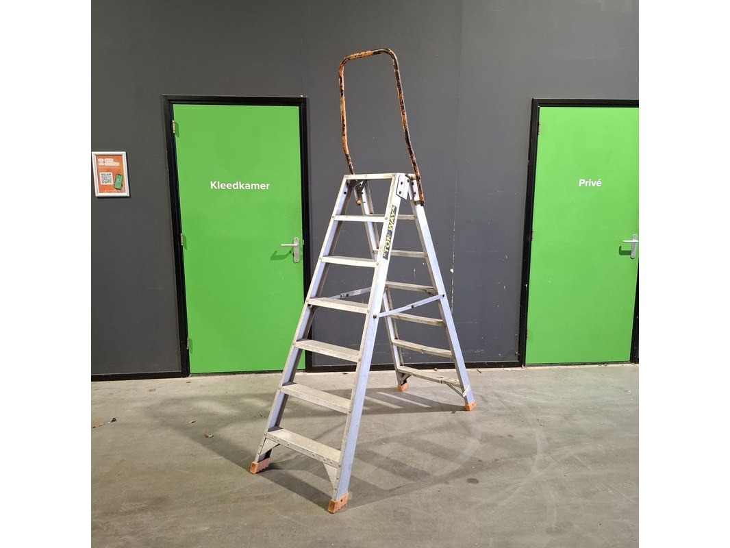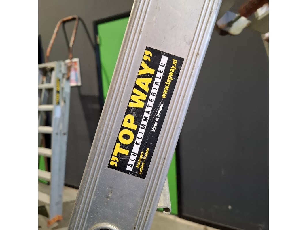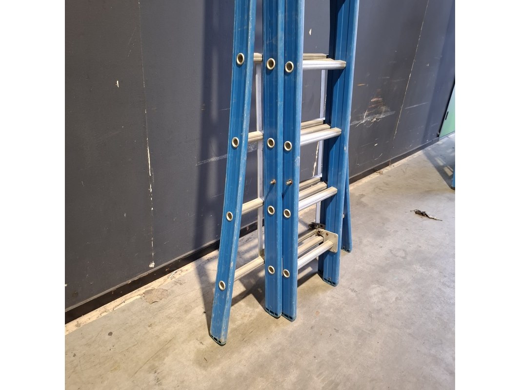 Product: Ladder en 2x A trap Conditie: Gebruikt Specificaties: Bestaande uit: - Ladder 3x12 trede - 2x A trap 2x7 trede