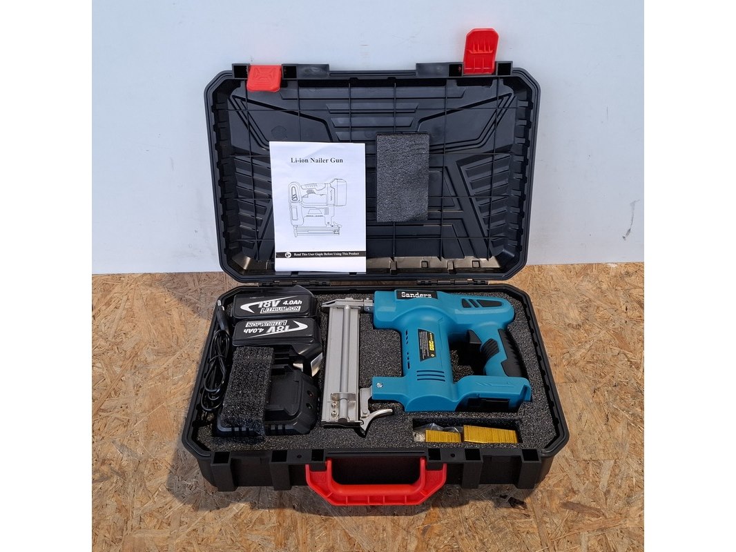 Merk: Sanderz Product: Accu spijkermachine Kleur: Blauw Specificaties: Inclusief lader en 2x accu, in systainer.