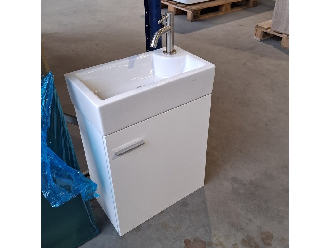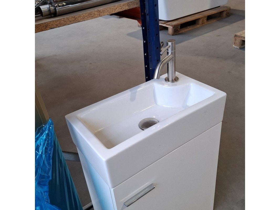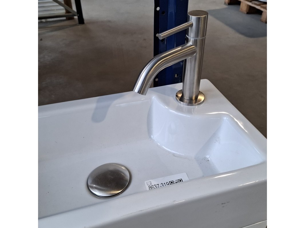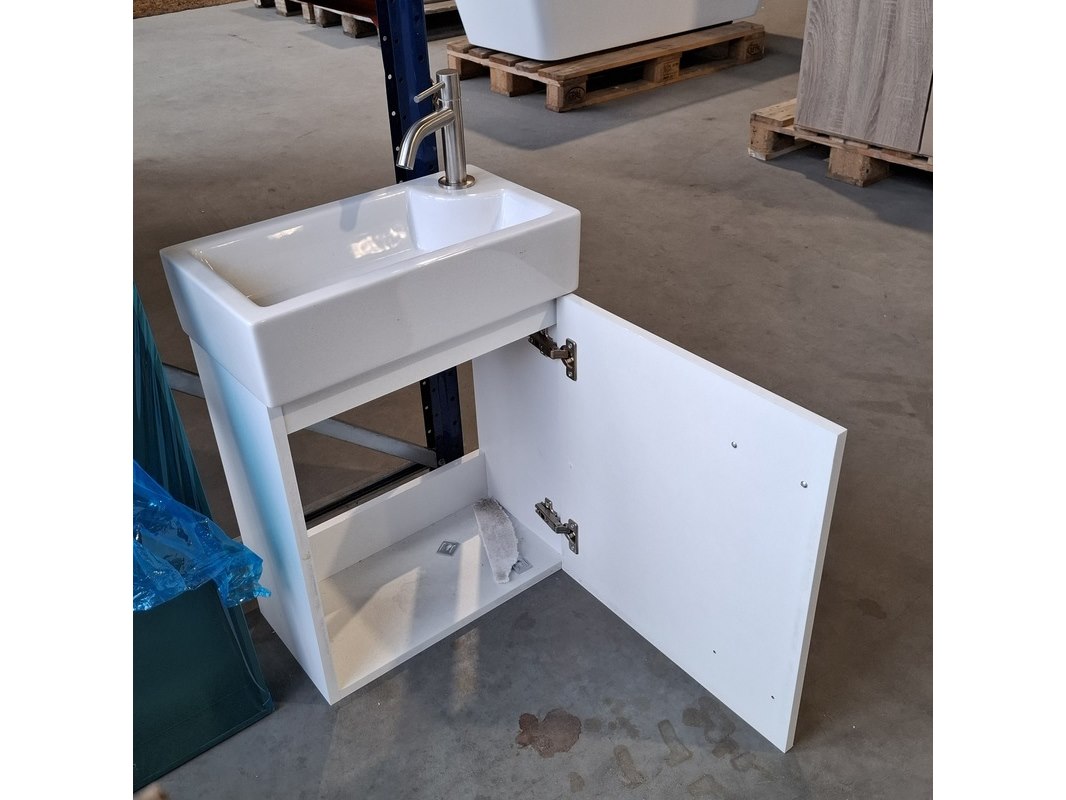 Product: Fonteinmeubel Kleur: Mat wit Afmeting: 45x25x60cm Specificaties: incl. keramische fontein, incl. rvs fonteinkraan, incl. rvs click waste