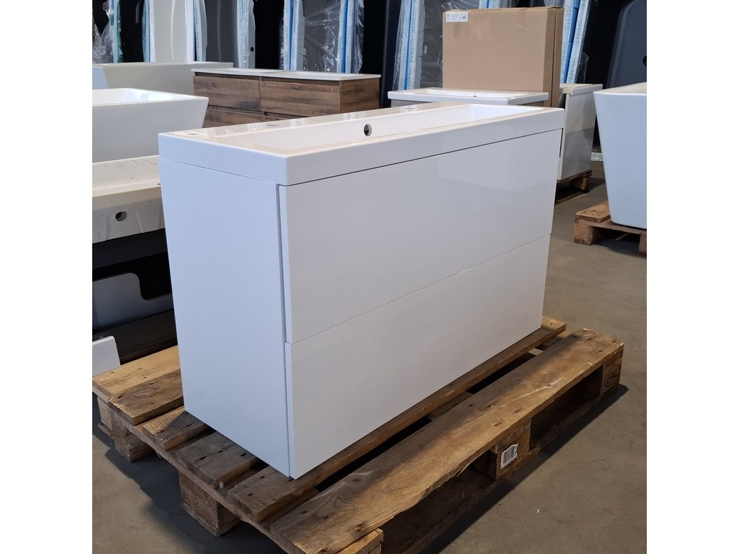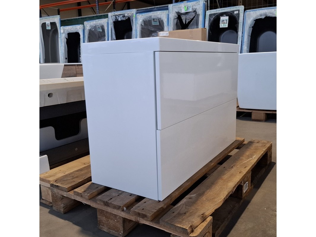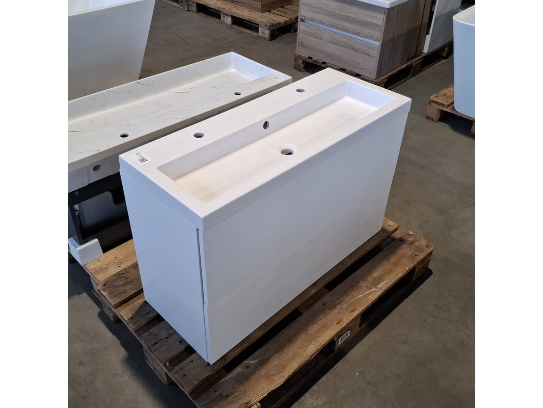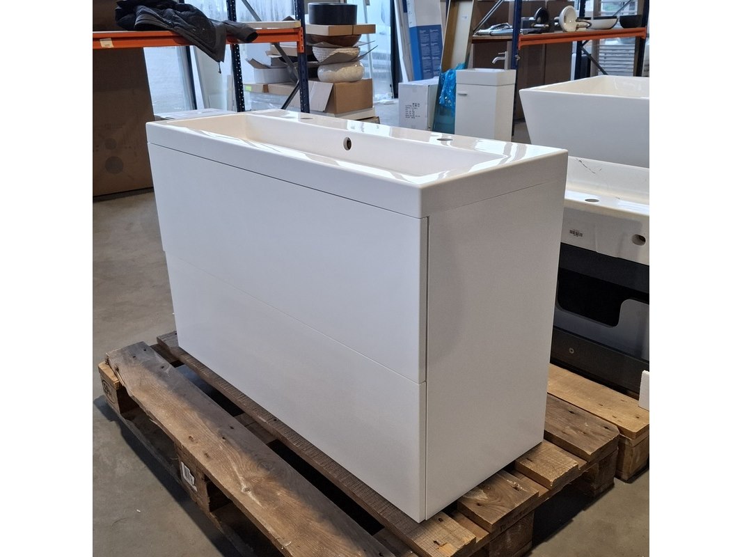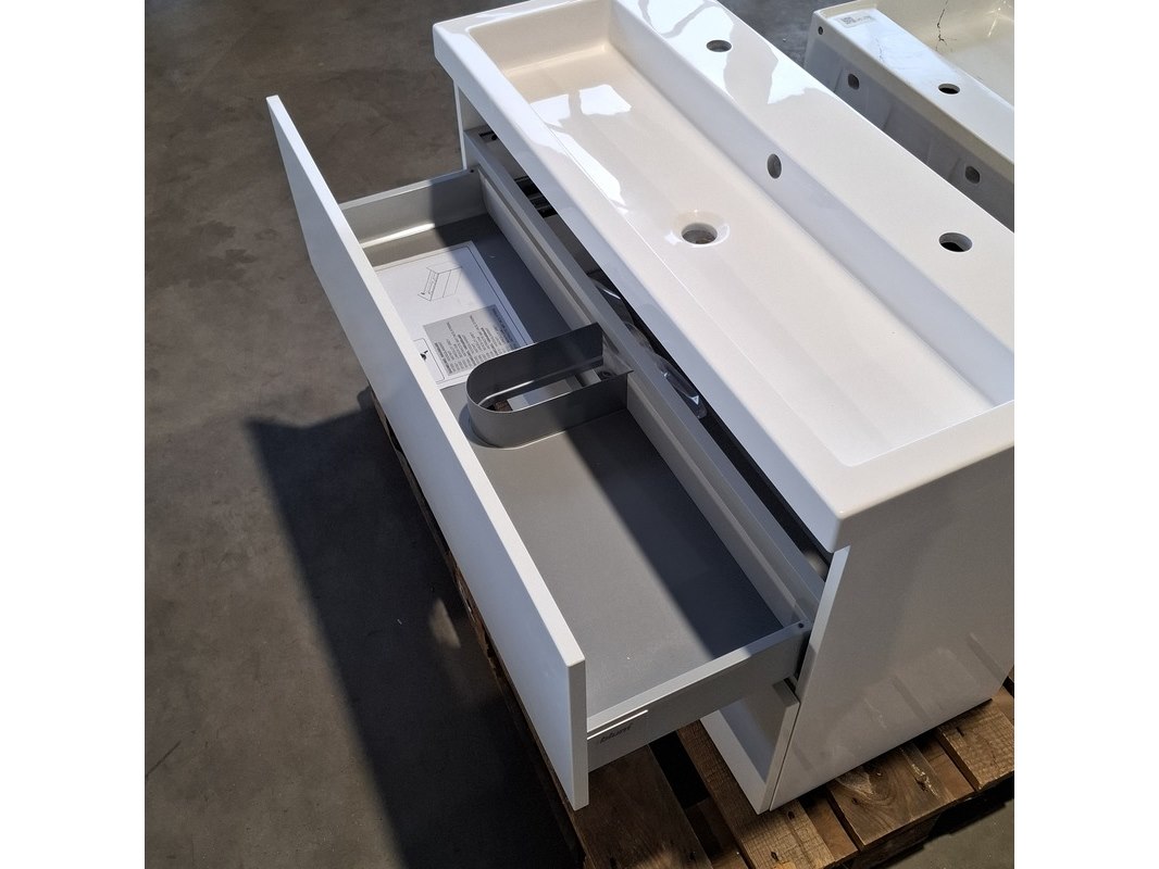 Merk: HR Badmeubelen Product: Badmeubel Kleur: Mat wit Afmeting: 100x40cm Specificaties: 2 lades met softclose, met Blum lade-geleide systeem, greeploos, push-open systeem, polybeton wastafel, 1 bak, 2 kraangaten